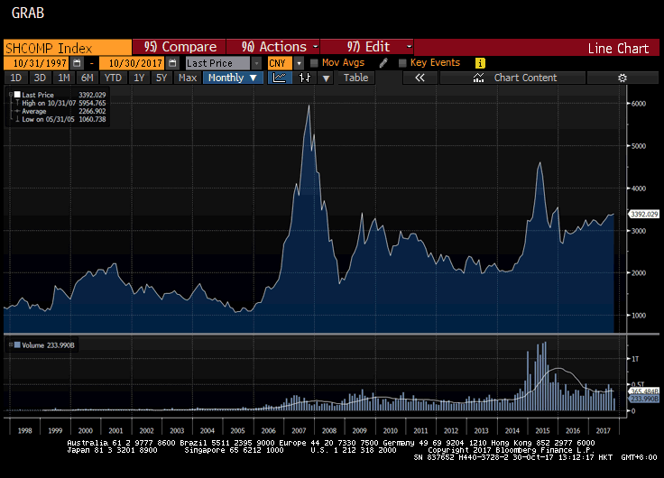 Interestingly, whilst many major equity markets power on to new all-time heights, the Shanghai Composite is still 50% below its peak of 10 years ago.