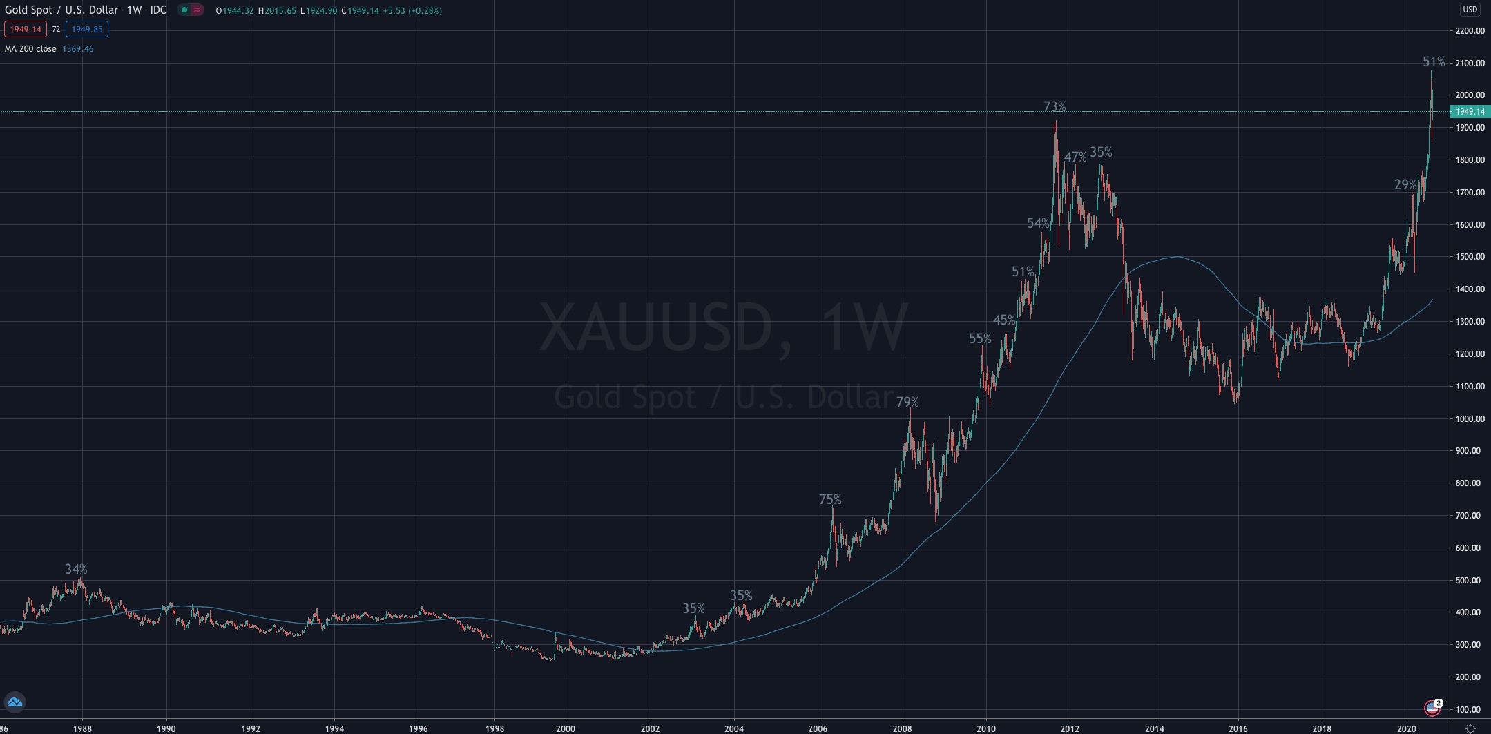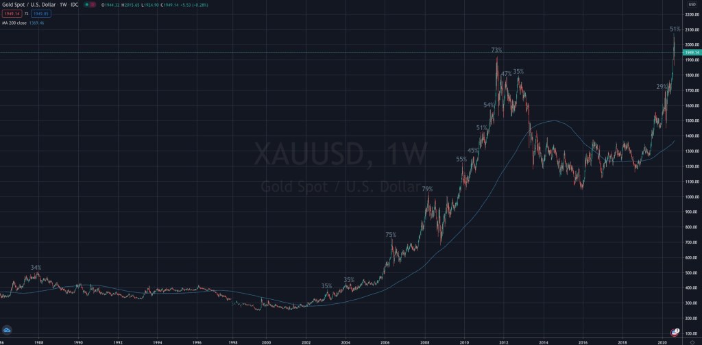 At selected peaks, I have added the percentage that the Gold price was trading above its “weekly” 200 day moving average.