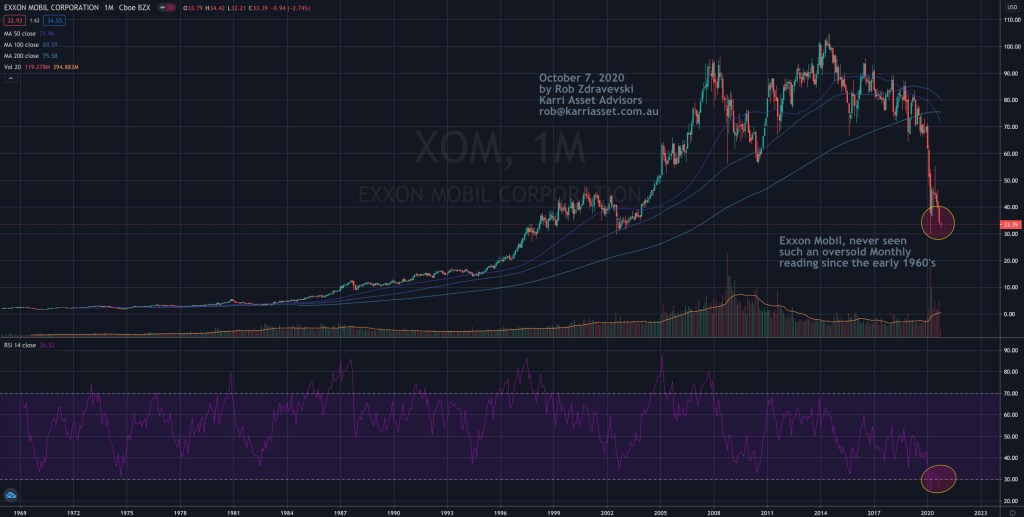 I have been negative on Big Oil but there have been some monumental moves lately. Some stocks are trading at “monthly” oversold levels not seen the 1960’s.
