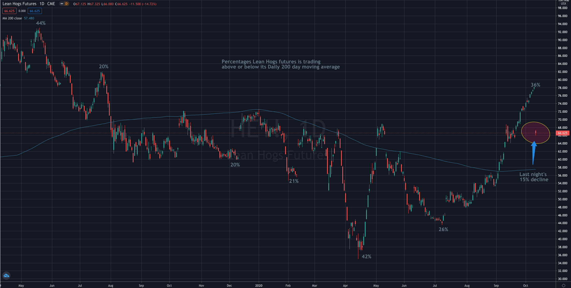 In the daily chart below, you can see how the price of Lean Hogs tends to ‘re-visit’ its 200 day moving average with regular occurrence and especially when it trades greater than 20% beyond that line.