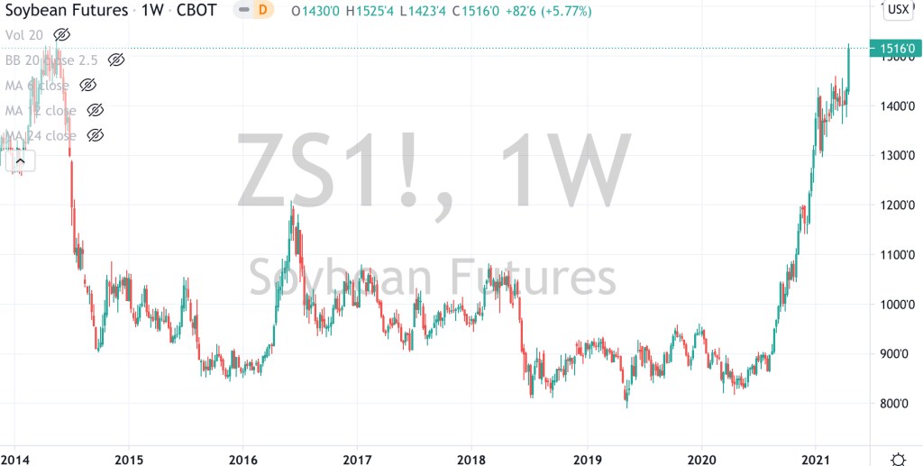 The most obvious trend amongst the rising price brigade are commodities from the ‘softs’ agricultural complex such Corn, Soybeans, Wheat, Coffee. Many advancing more than 5% for the week and exhibiting parabolic moves.