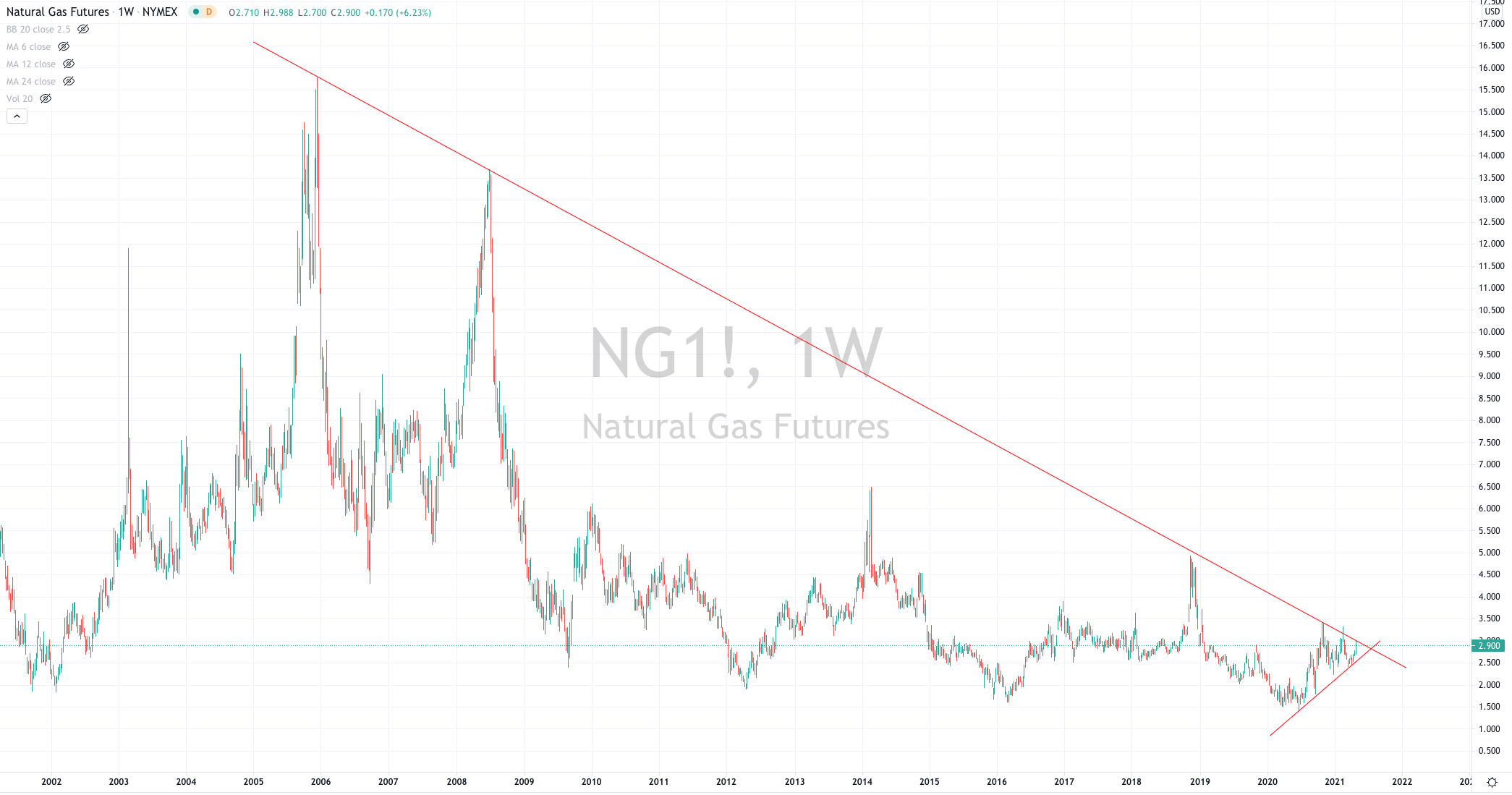 Here is a 20 year chart covering the price of Henry Hub Natural Gas, plotted on a weekly basis.