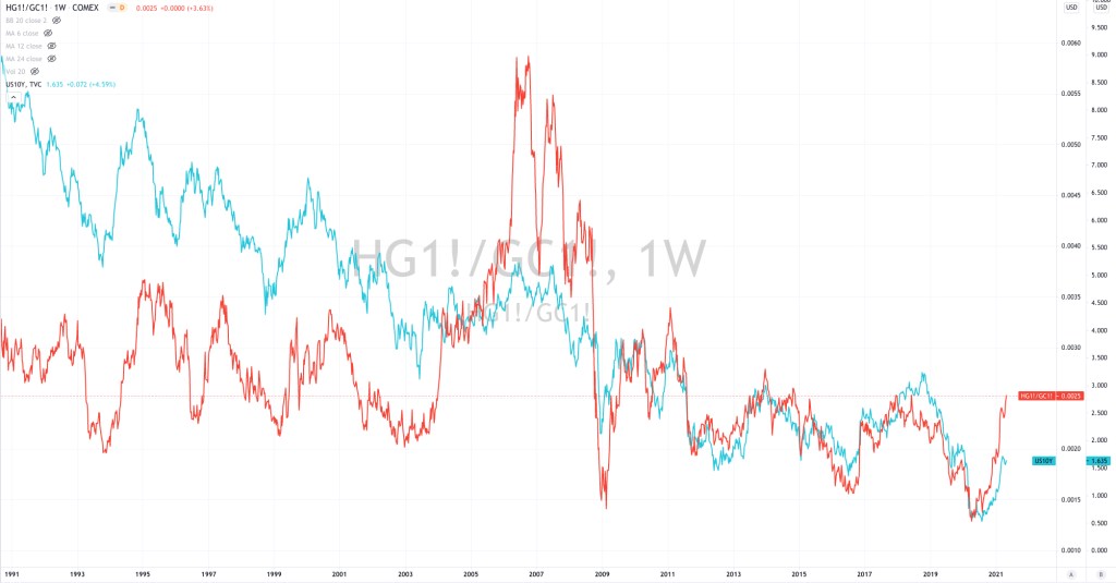 A sharp rise in this ratio is often driven by outsized price rises in copper when compared to the gold price, which is the case presently.