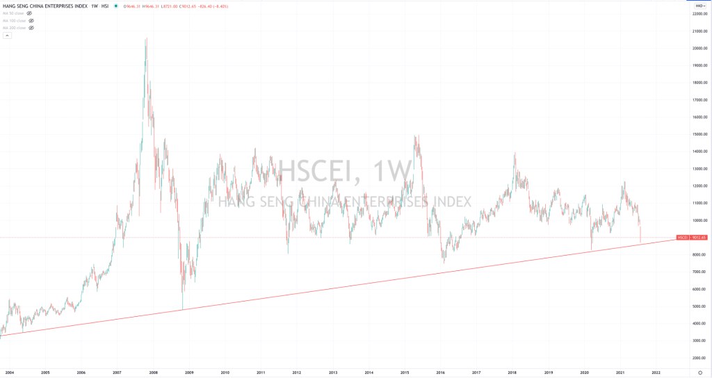 The Hang Seng China Enterprises Index (HSCEI) closed on Tuesday July 28, 2021 at 8,880 and has fallen 27% from a recent high seen 5 months ago, to now being at its most Oversold Weekly reading since February 2016.