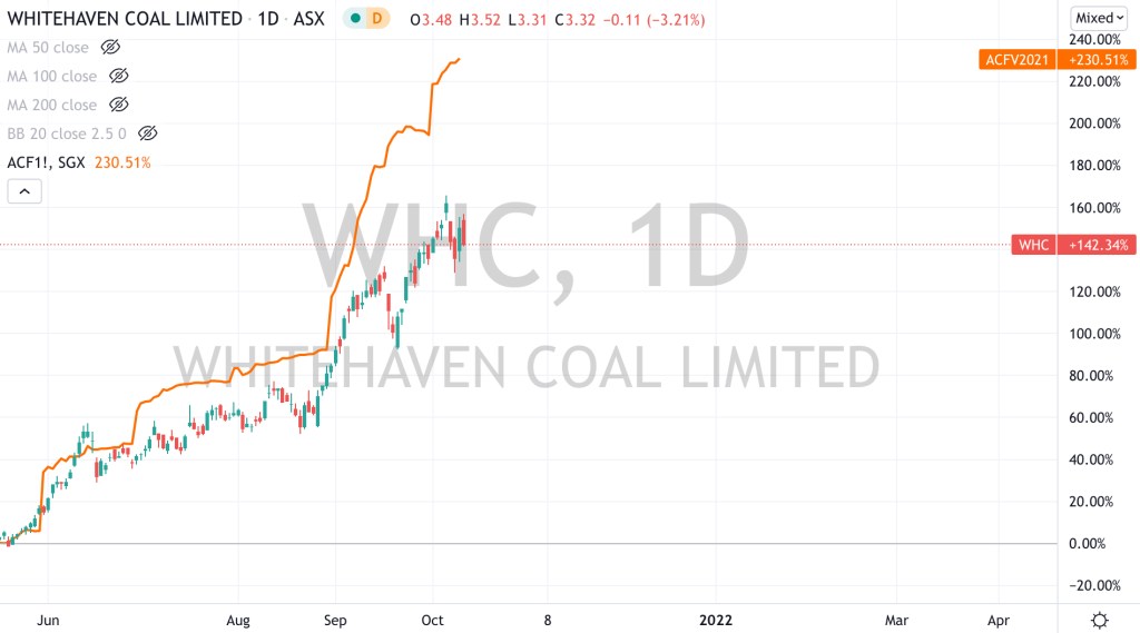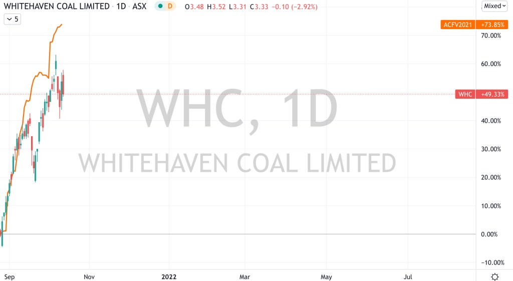 The (under)performance of Whitehaven over the 2 timeframes shown below, especially in light of the recent surge in coal prices tells me that the market isn’t a believer.