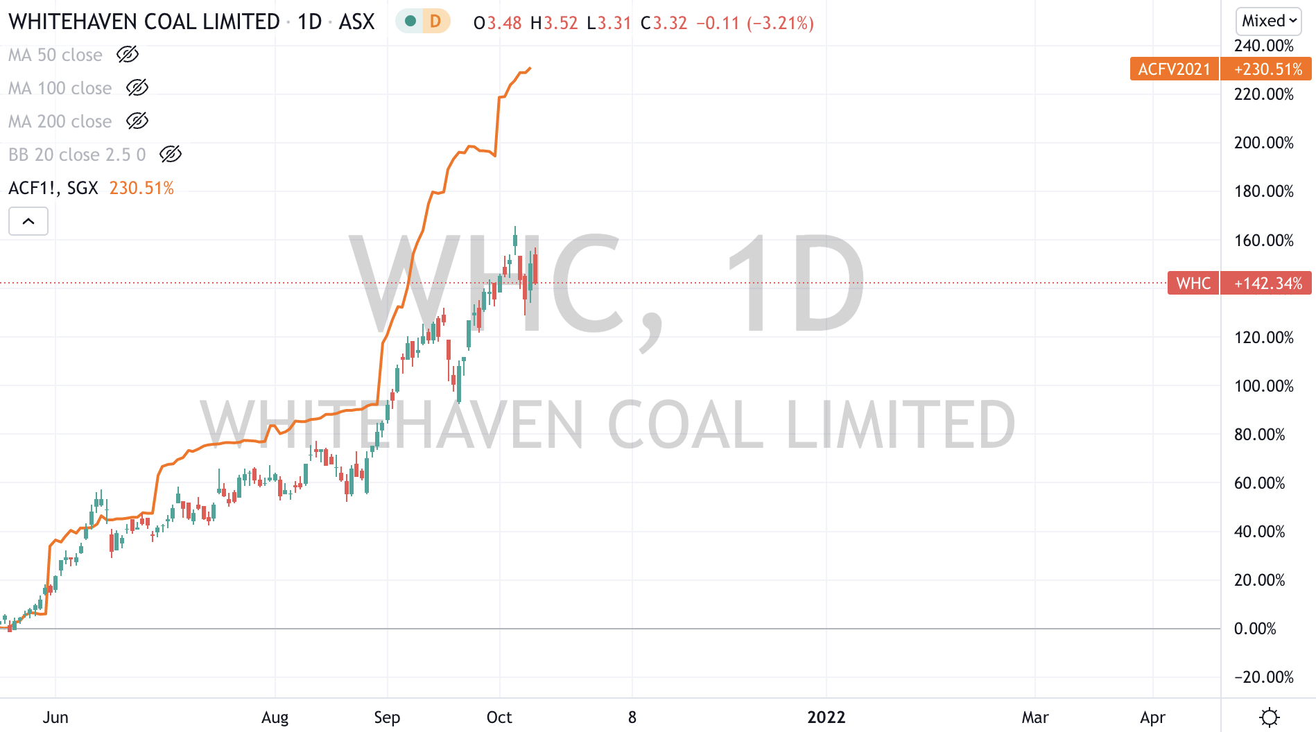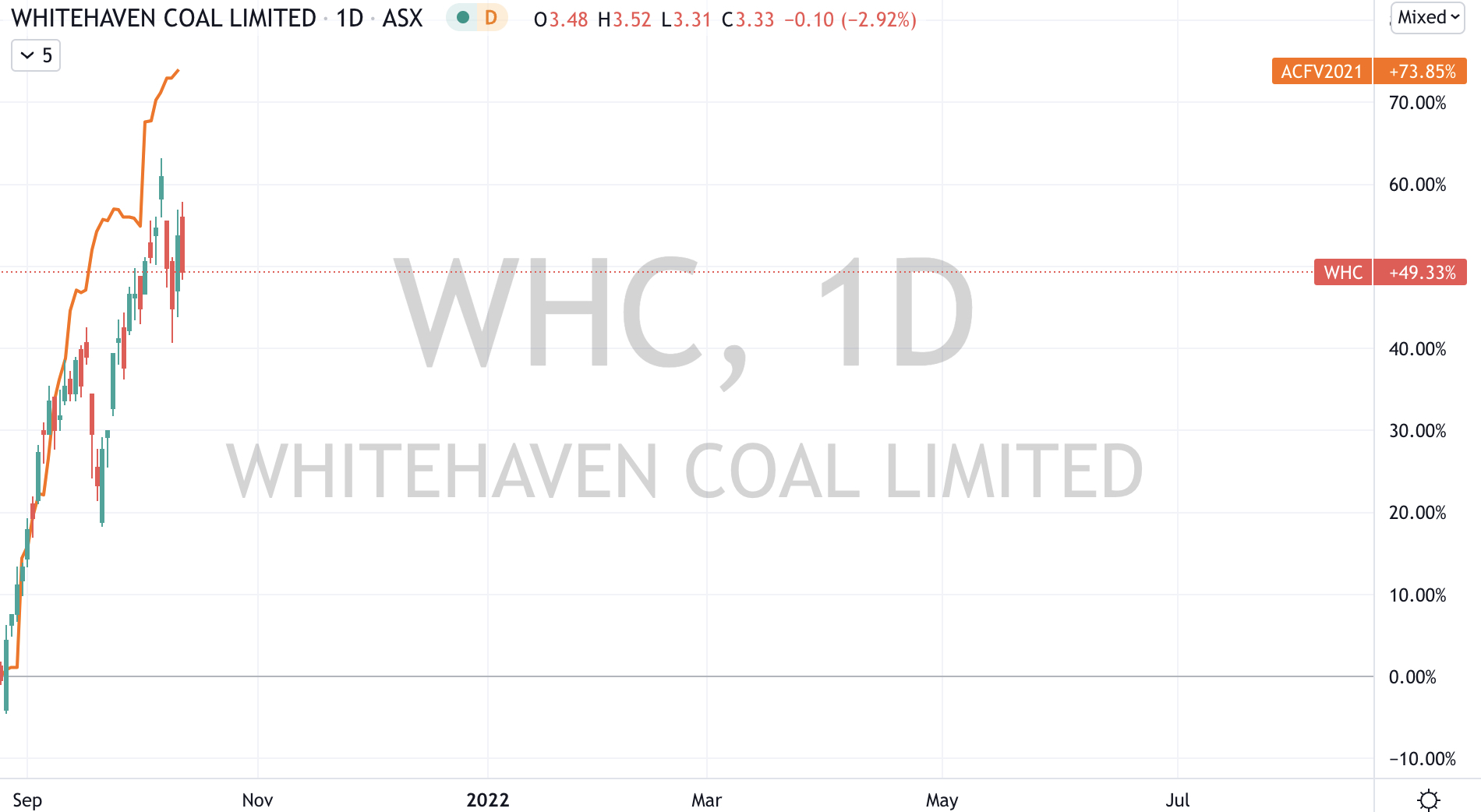 The (under)performance of Whitehaven over the 2 timeframes shown below, especially in light of the recent surge in coal prices tells me that the market isn’t a believer.