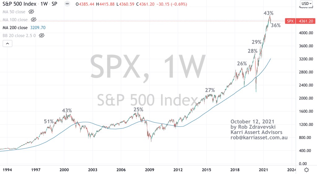 My notations show the extreme percentages that the SPX was trading above its 200 week moving average. It was 43% a couple weeks ago and is at a relatively high 36% today.