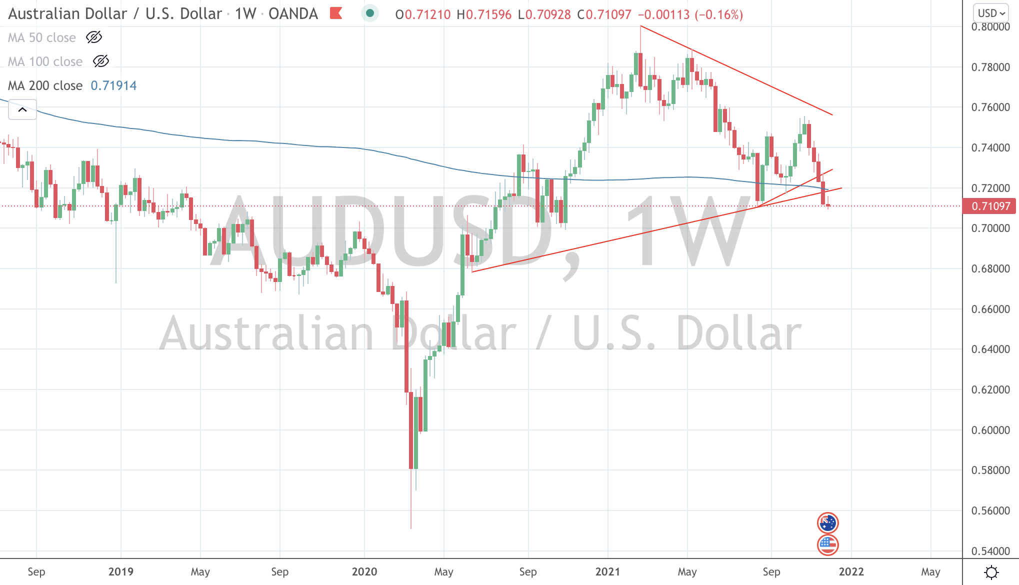 Since the 1st quarter of 2021, the AUD (versus USD) has made lower high’s and new lower low’s.