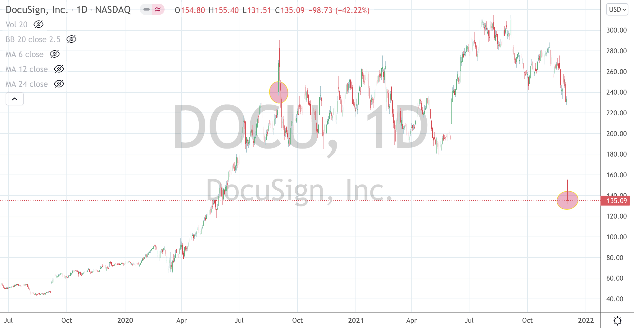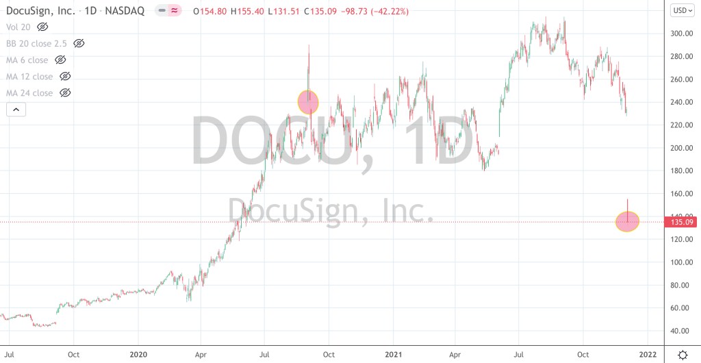 On Friday, shares in U.S. listed Docusign (DOCU) slumped 42% to close at $135 per share.