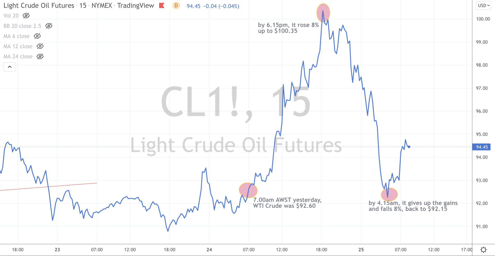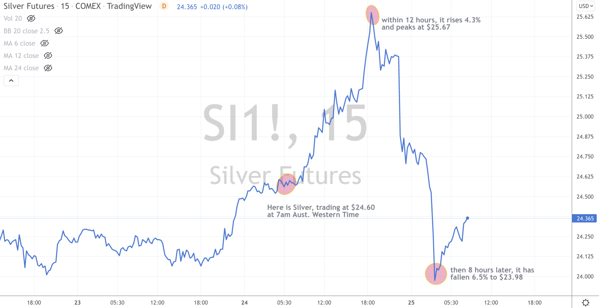 I’ve added some notes to the charts below which show WTI Crude and Silver trading over the past 30 hours in 15 minute intervals.