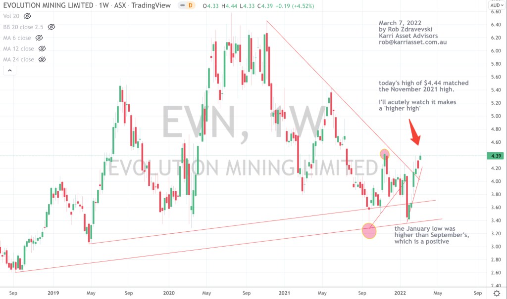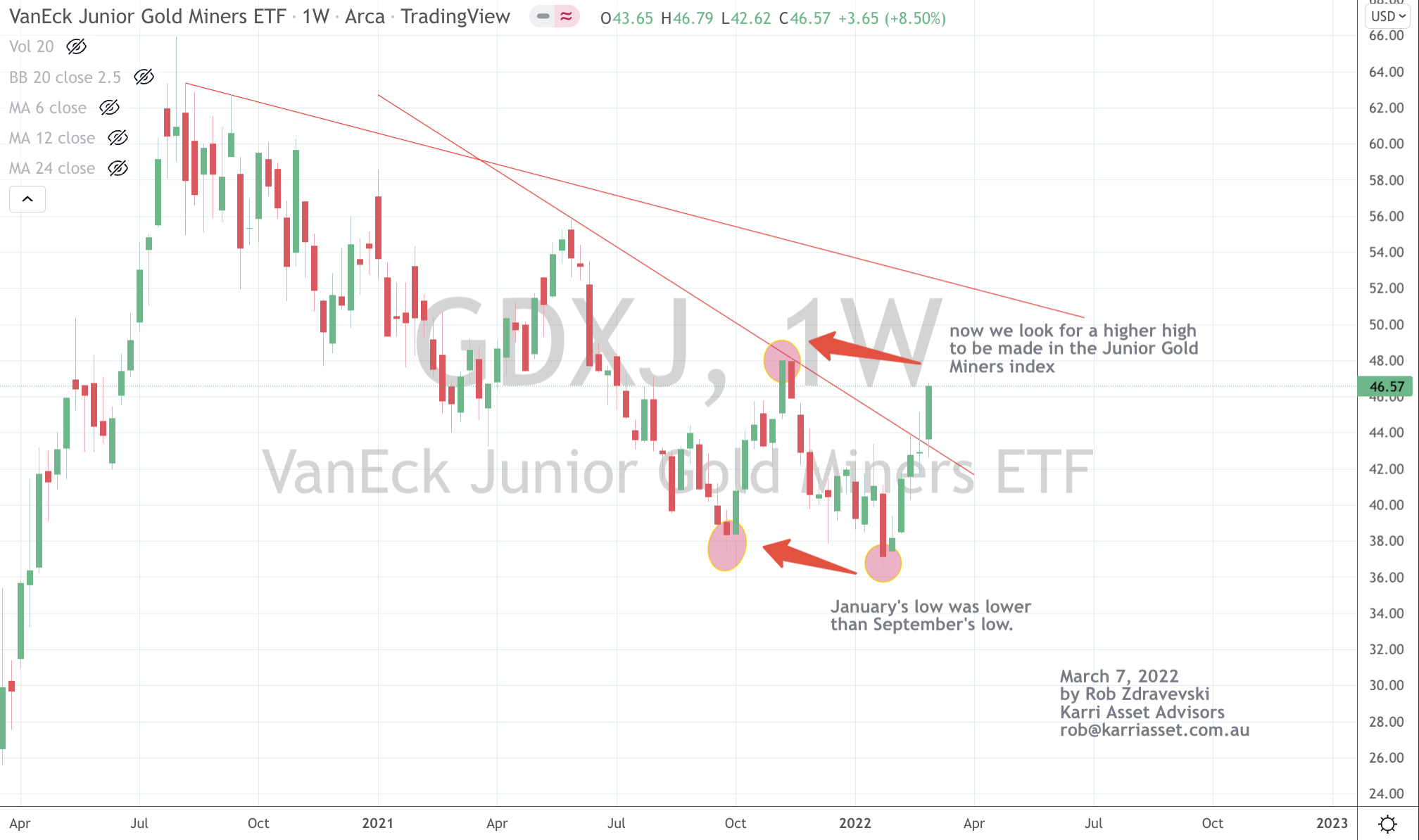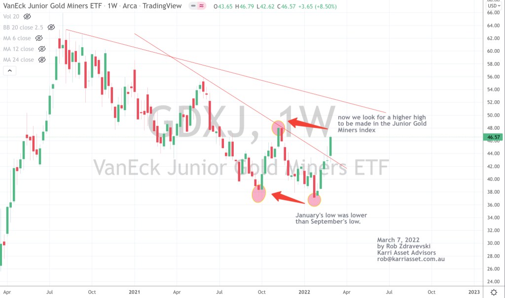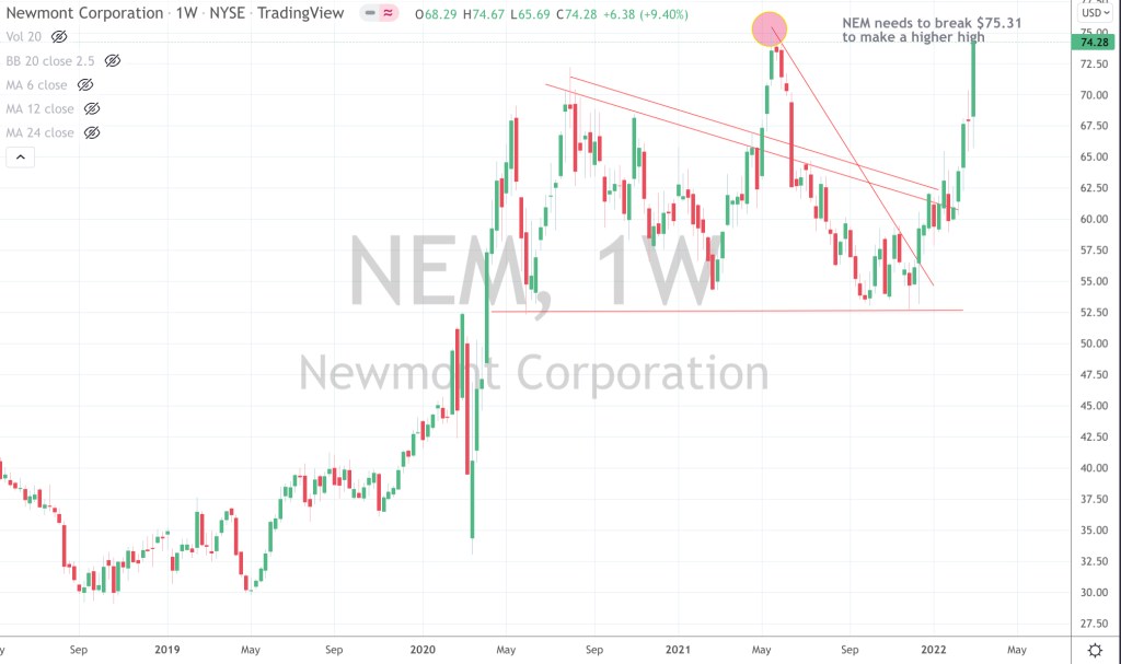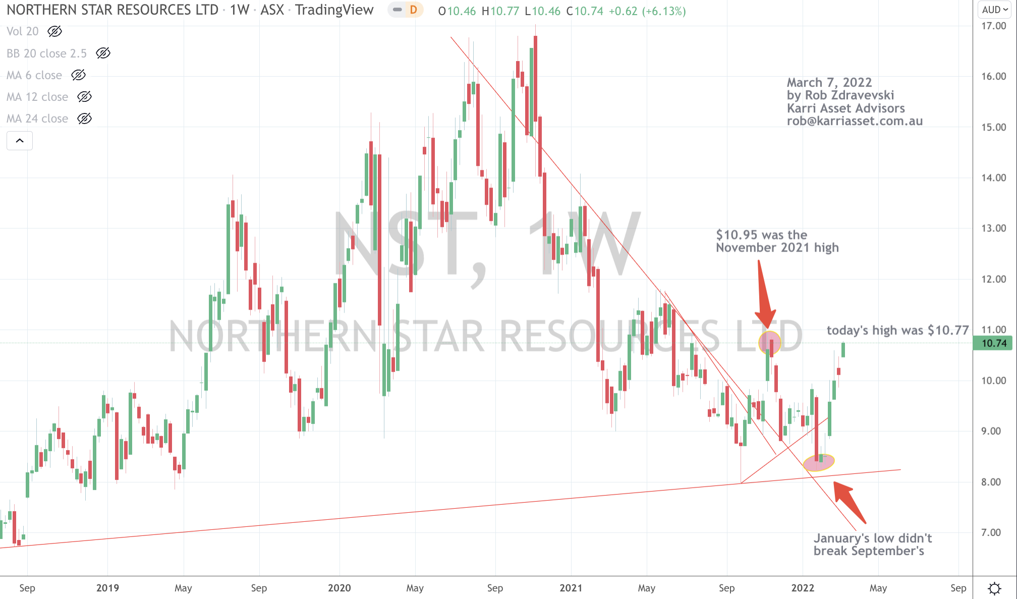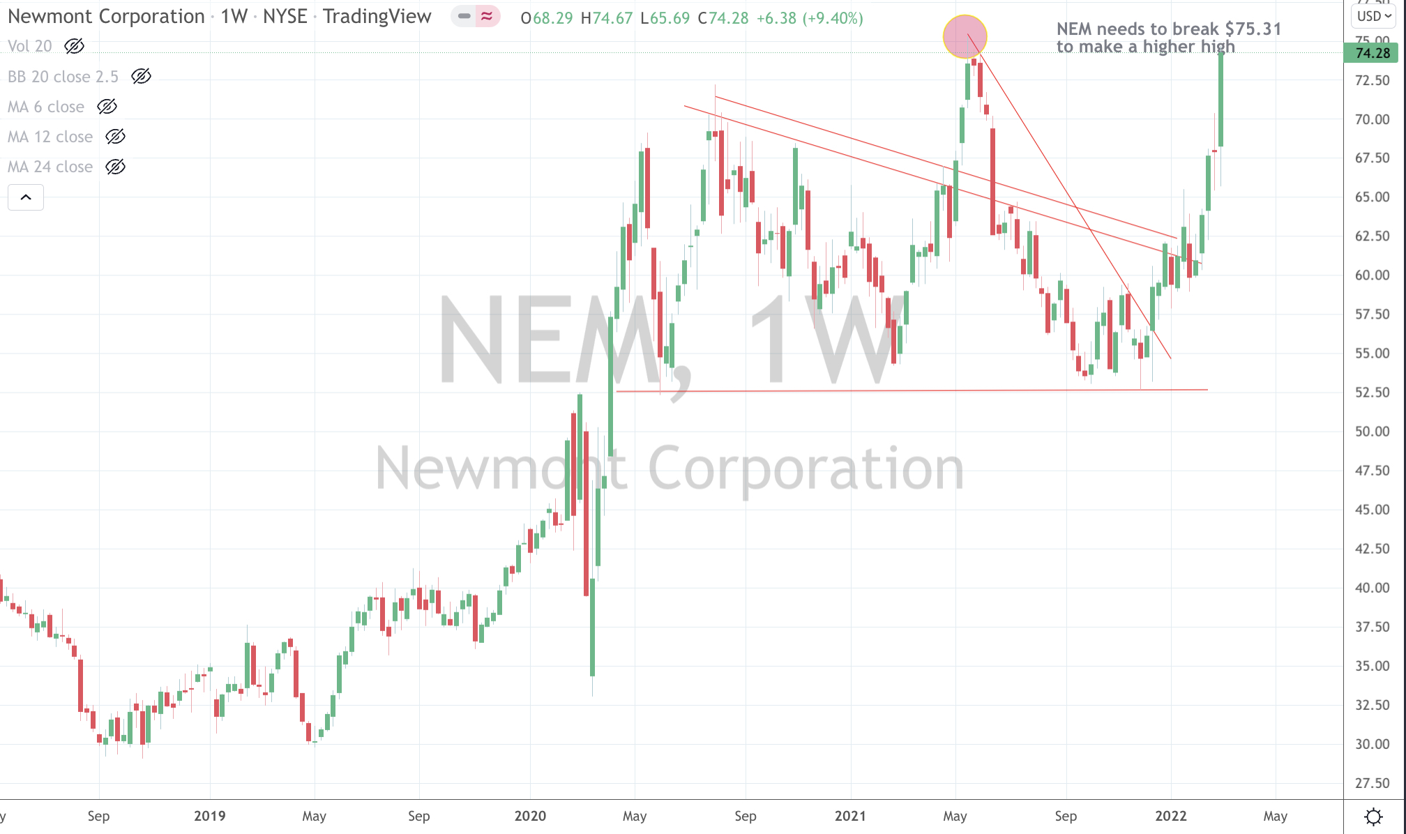 The charts below feature the prices of Newmont and the U.S. junior gold miners index along with Australia’s Northern Star Resources and Evolution Mining.