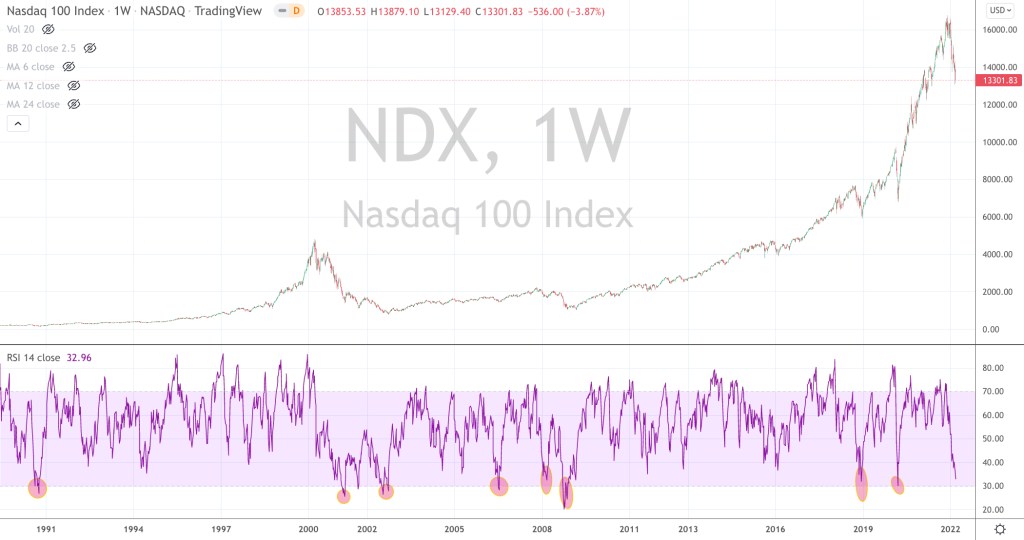 The weekly Relative Strength Index (RSI) for the Nasdaq 100 Index has just registered a reading of 33 or less, for only the 9th time in 34 years.