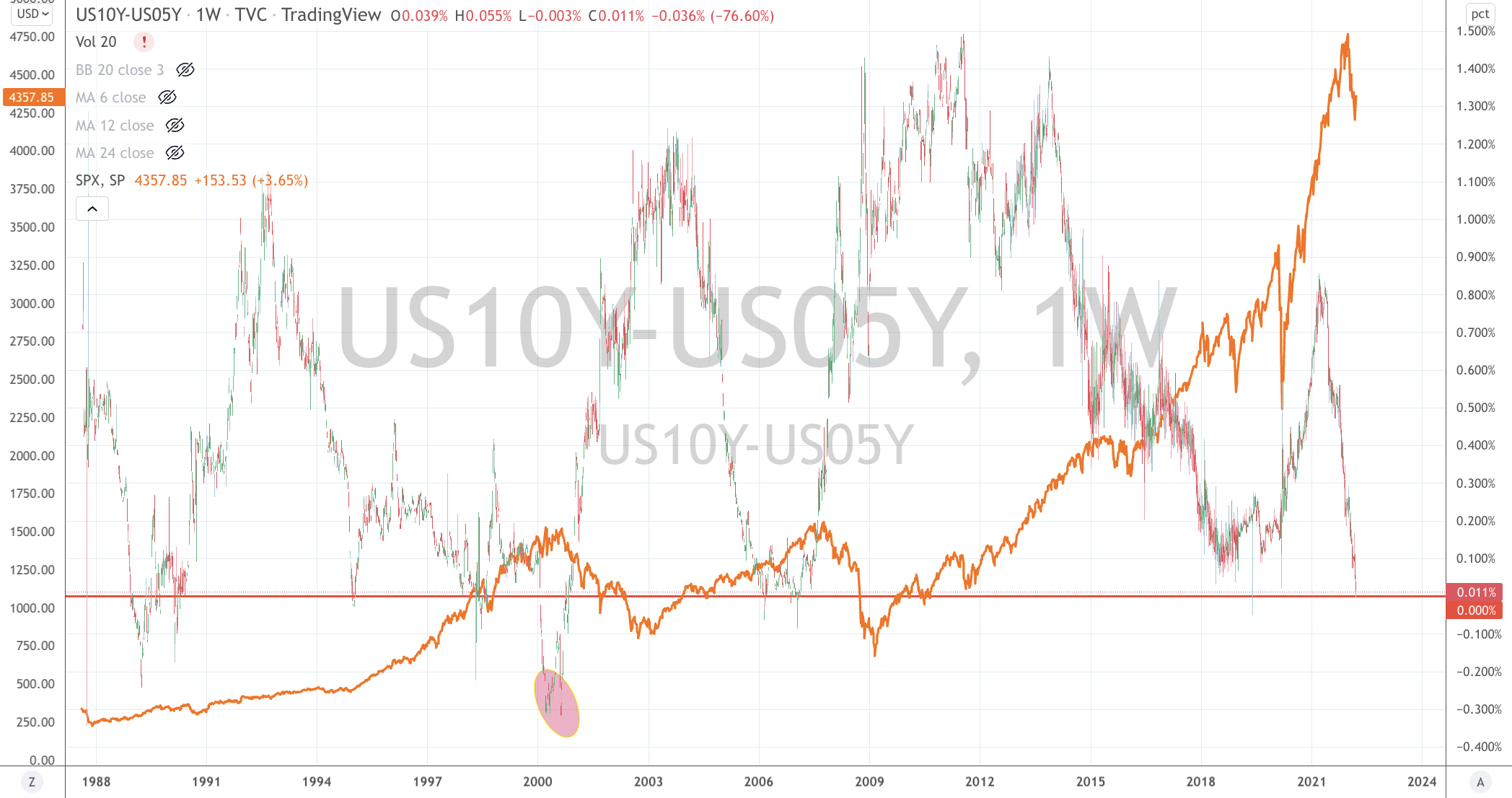 Financial media are excitedly reporting about the US10Y minus US05Y spread inverting.