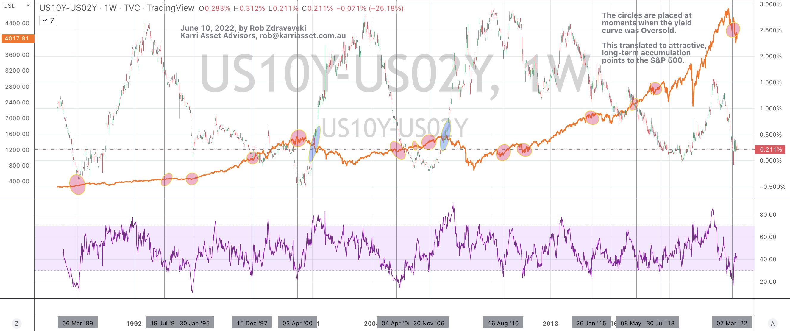 The two moments when this thesis failed was when the yield curve notably traded and crossed above the S&P 500, which is highlighted by the blue ellipses.
