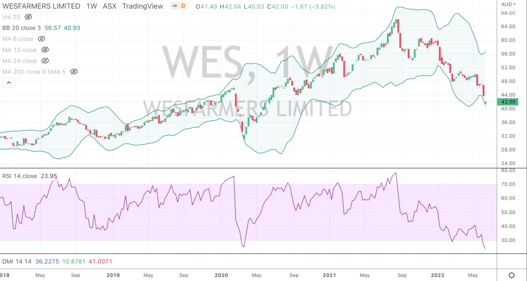 The example below, shows ANZ Bank (ANZ.ASX) and Wesfarmers (WES.ASX) both trading to 3 standard deviations and reaching Oversold levels on a Weekly basis.