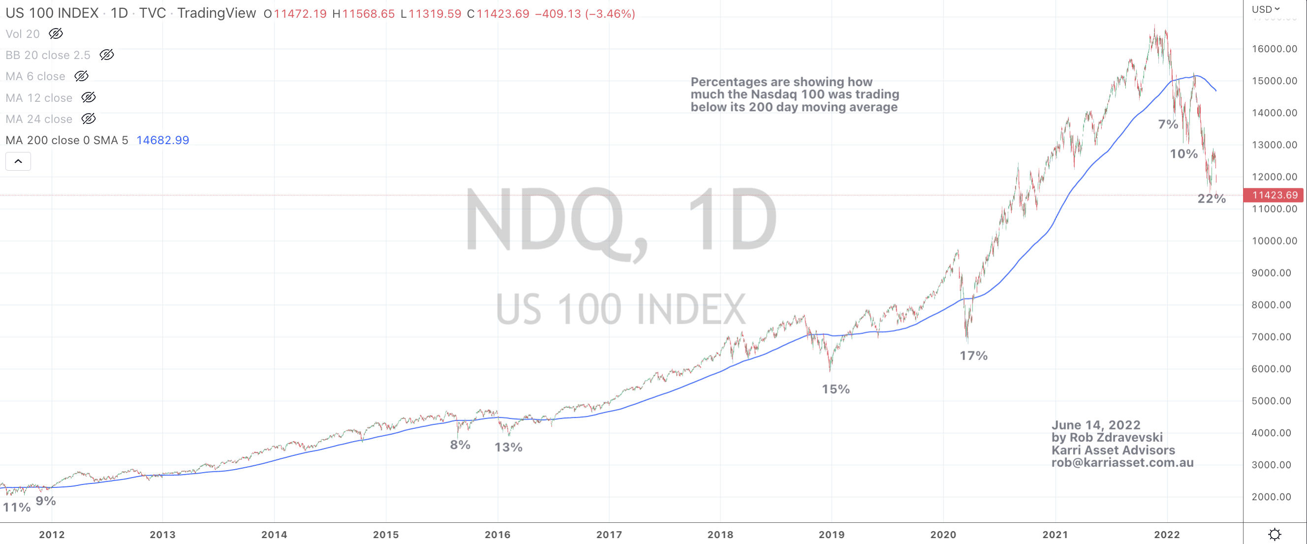 I’m reposting an updated chart with annotations showing the percentage that the Nasdaq 100 is trading below its 200 day moving average.