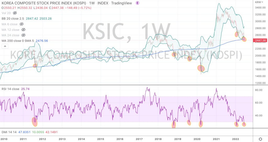 the chart below shows circles where South Korea’s Kospi has done so and bodes well as moments to accumulate, should your investment time horizon be longer than 8 minutes.