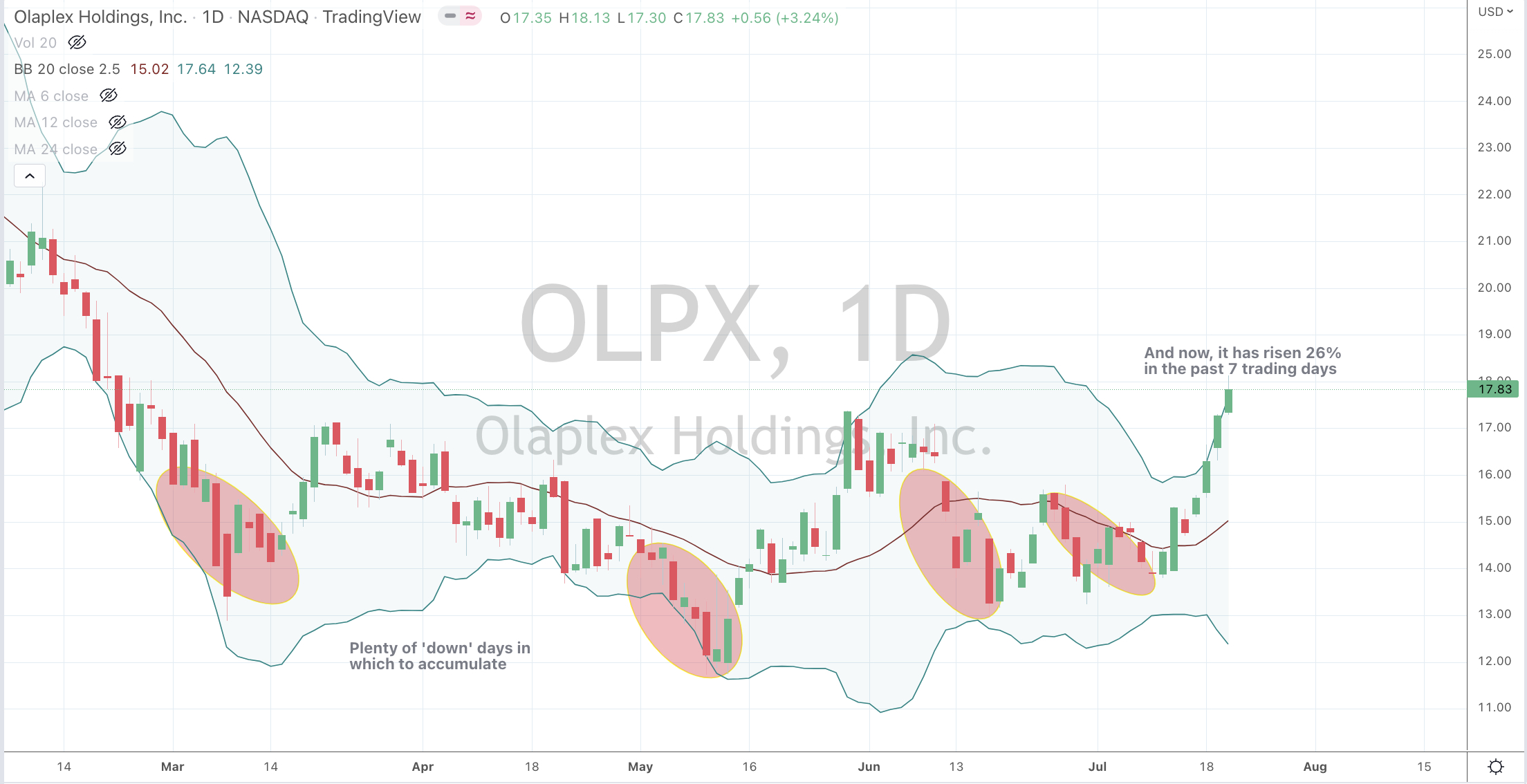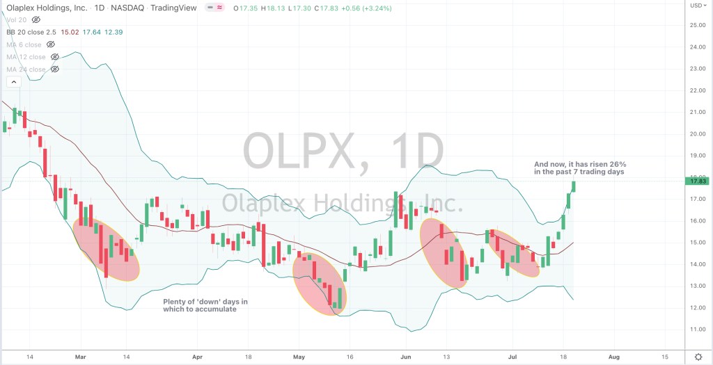 In the chart below, U.S. listed Olaplex has risen 26% in the past 7 trading days.