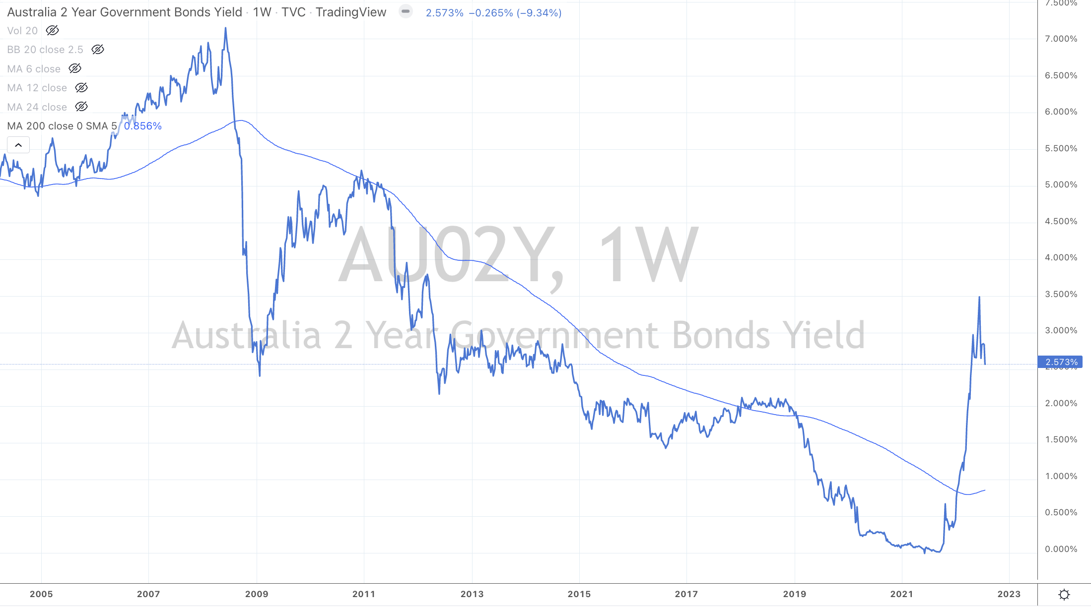 For example, the Australian 2 year bond yield has fallen from 3.60% in the past 4 weeks to 2.57%. I think, it’s plausible that it works its way down to the 1.55% mark over the coming months.