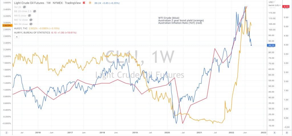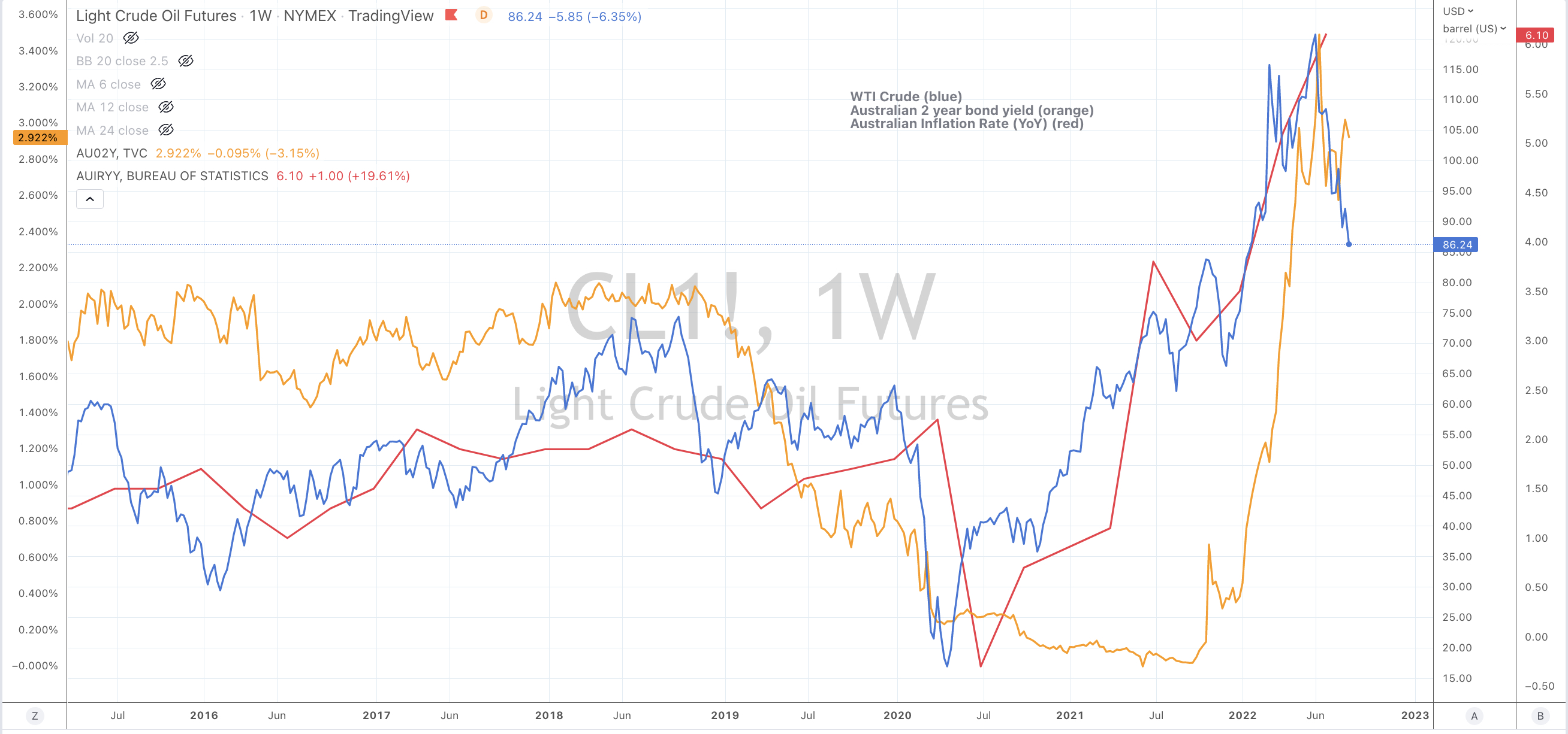 Moves in Crude Oil seems to lead the next move in Australian inflation and the Australian 2 year bond yield.