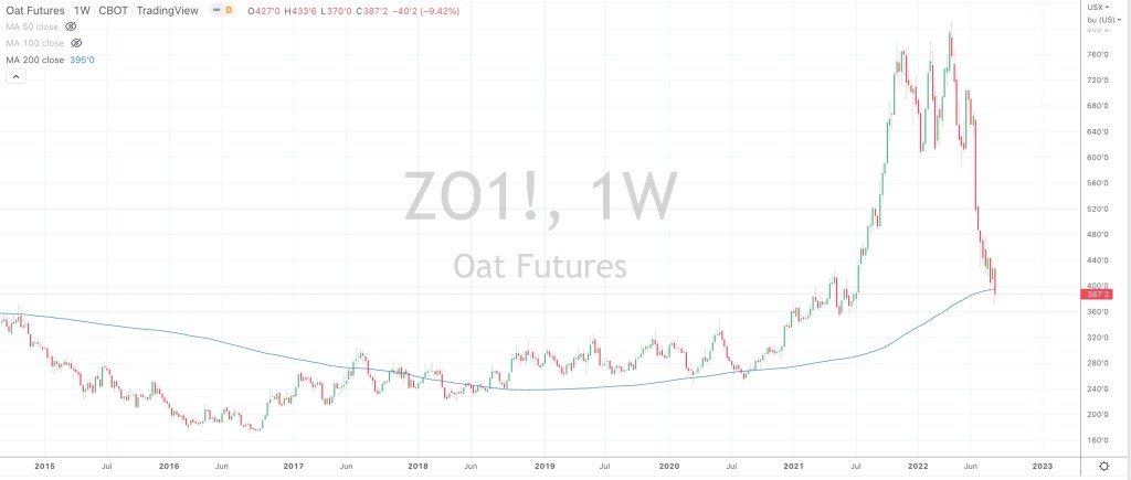 Oats fell enough to be Oversold and mean revert to its 200 week moving average.