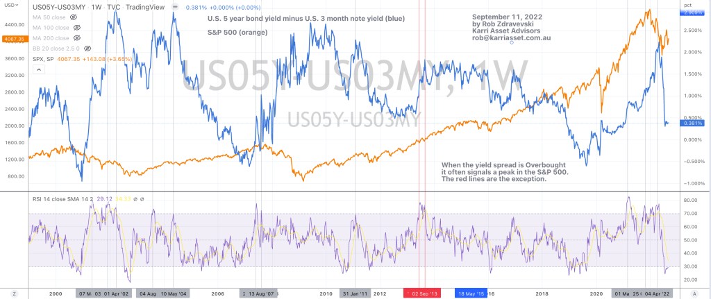 When the spread (or yield curve) of the U.S. 5 year government bond yield <minus> 3 month yield is overbought on a Weekly RSI, it closely (and tactically) signals a peak in the S&P 500.