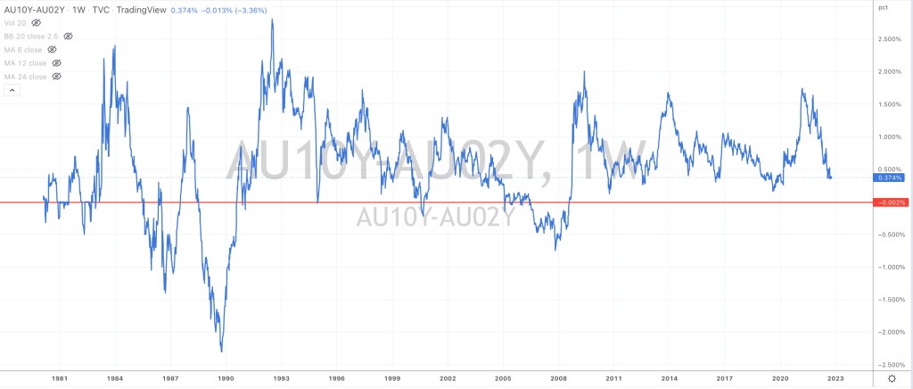 So back to the traditional 10 year minus 2 year…..and unlike the United States, the Australian yield curve is not inverted.