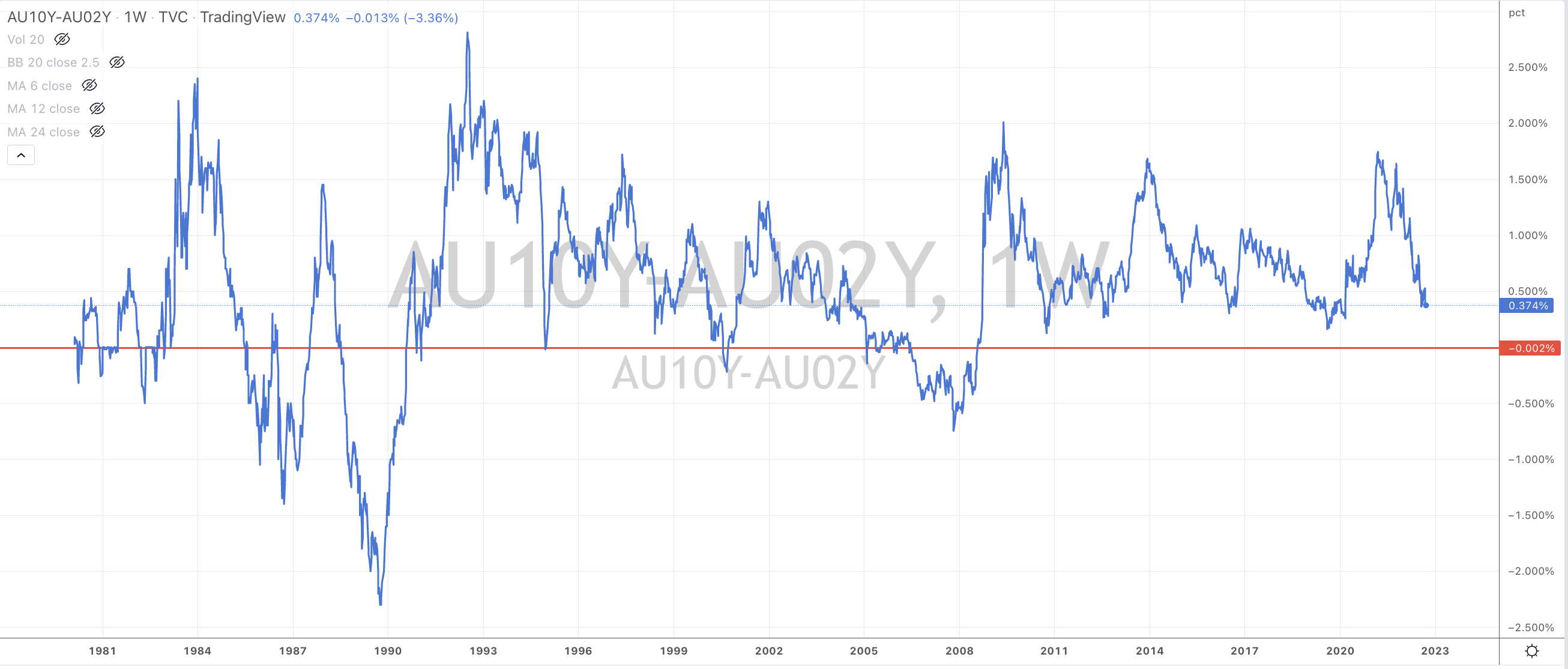 So back to the traditional 10 year minus 2 year…..and unlike the United States, the Australian yield curve is not inverted.