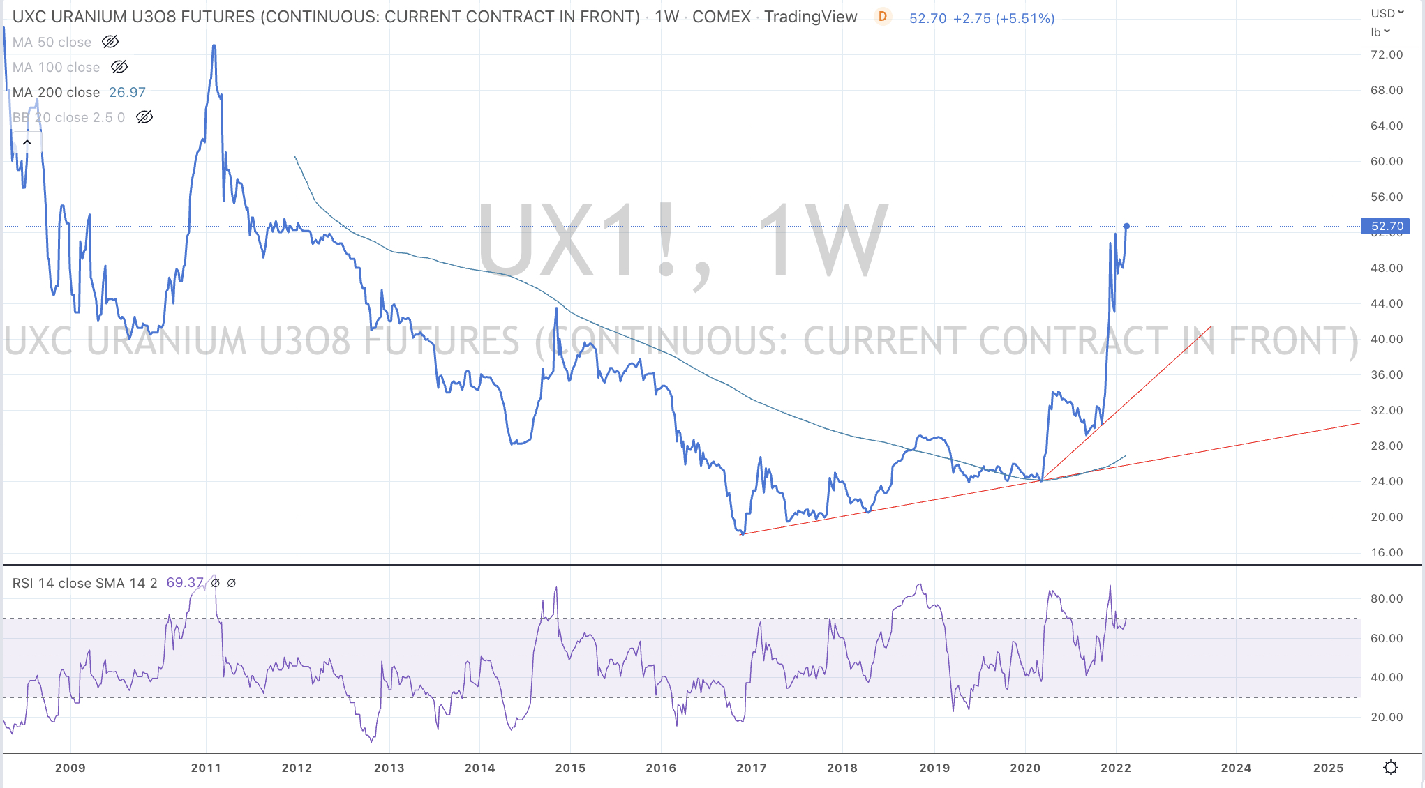 Furthermore, Uranium is trading at a stretched percentage (95%) above its 200 week moving average.