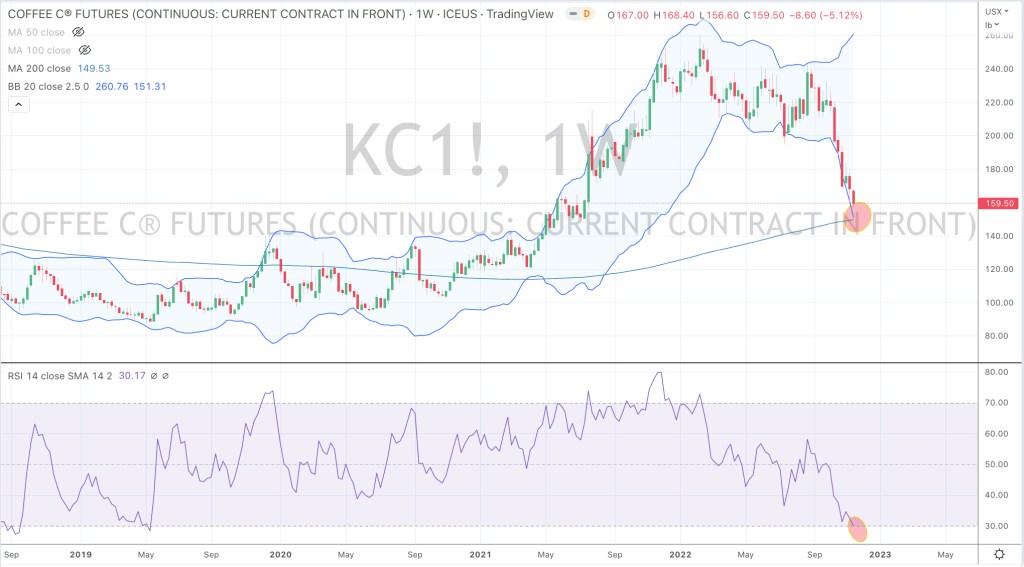 On February 2, 2022, I wrote that I expect the price of coffee to halve and I made reference of it ‘kissing’ its 200 week moving average.