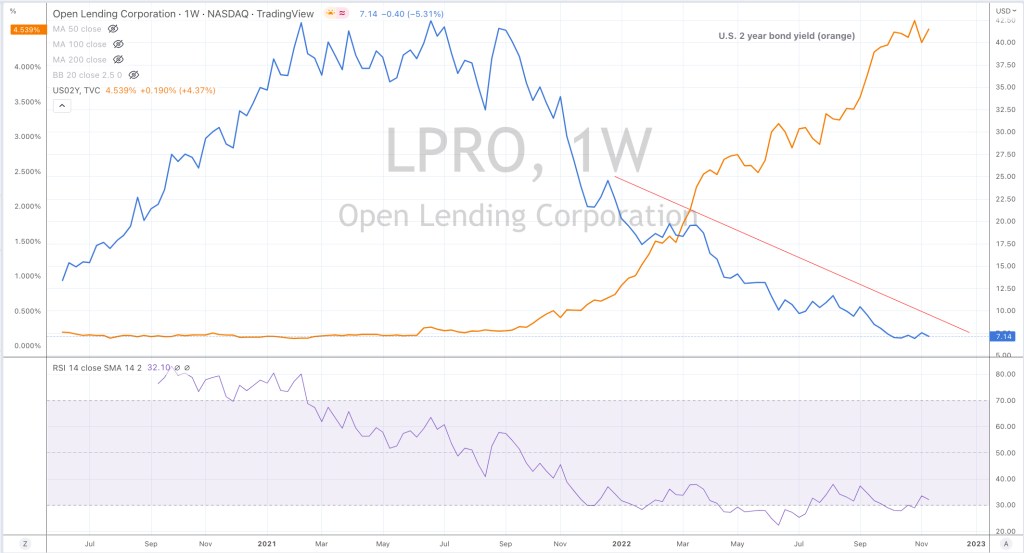 My interest was piqued when I overlaid the price chart of LPRO against the U.S. 2 year bond yield. High interest rates is bad for Open Lending’s business. What if the opposite occurred?