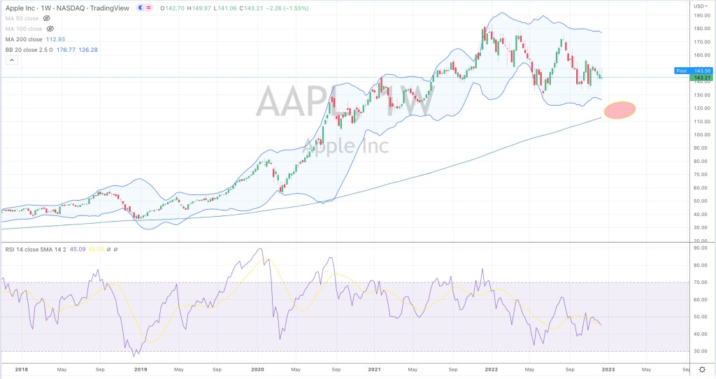 Apple is the last standout of the FAANGM stocks to mean revert back to its 200 week moving average. Last week, even honorary FAANGM stock, Tesla traded down to this mean.