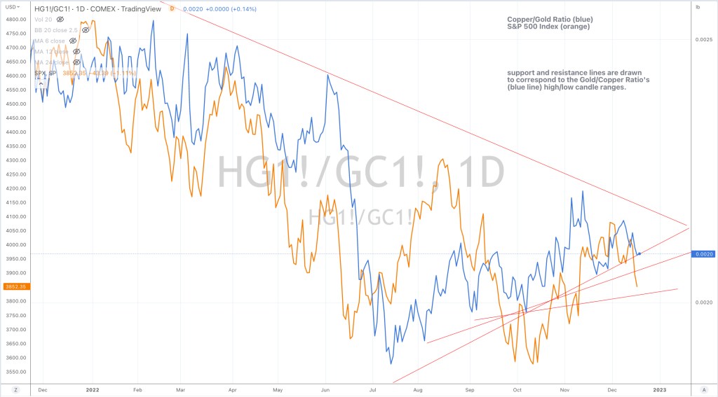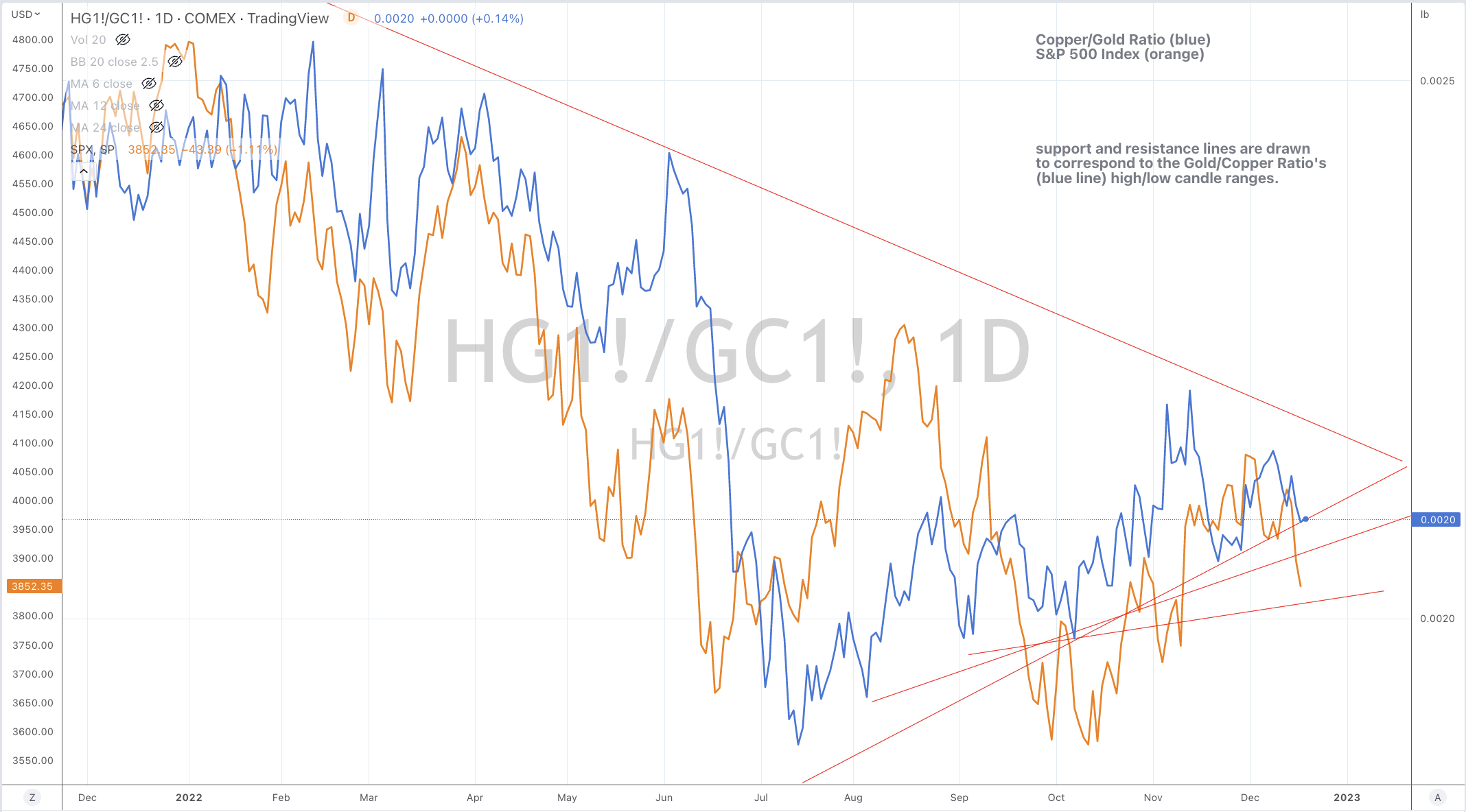 The chart below overlays the Copper/Gold Ratio with the S&P 500 along with a couple support and resistance lines thrown in.