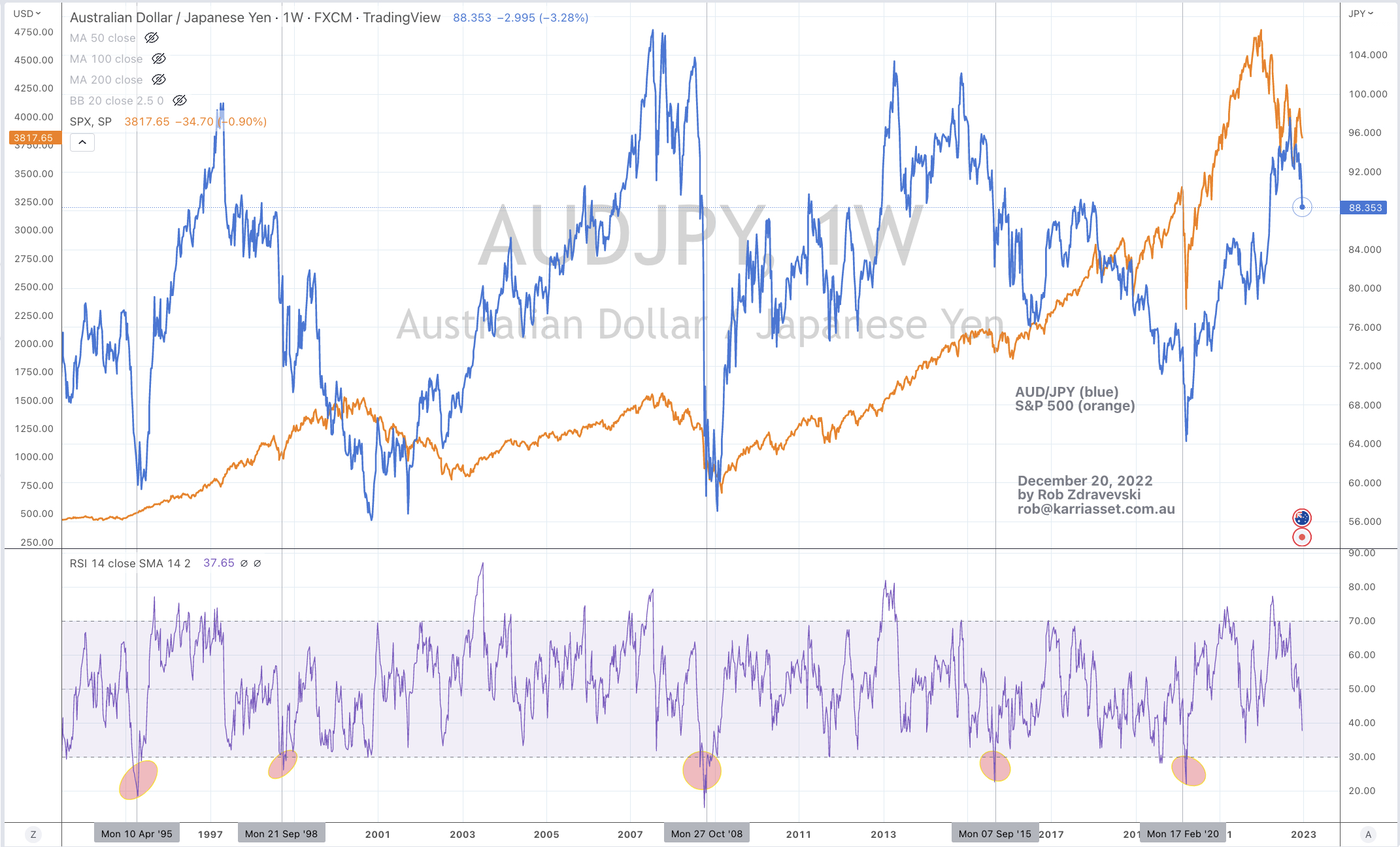 When the AUD/JPY touches oversold on a weekly basis, ’tis tends to be an attractive accumulation moment in the S&P 500.