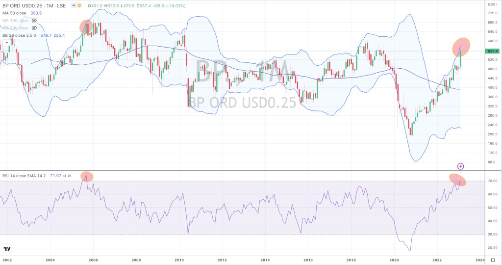 Today, BP’s share price is “the most overbought” (on a Monthly basis) than anytime over the past 20 years.