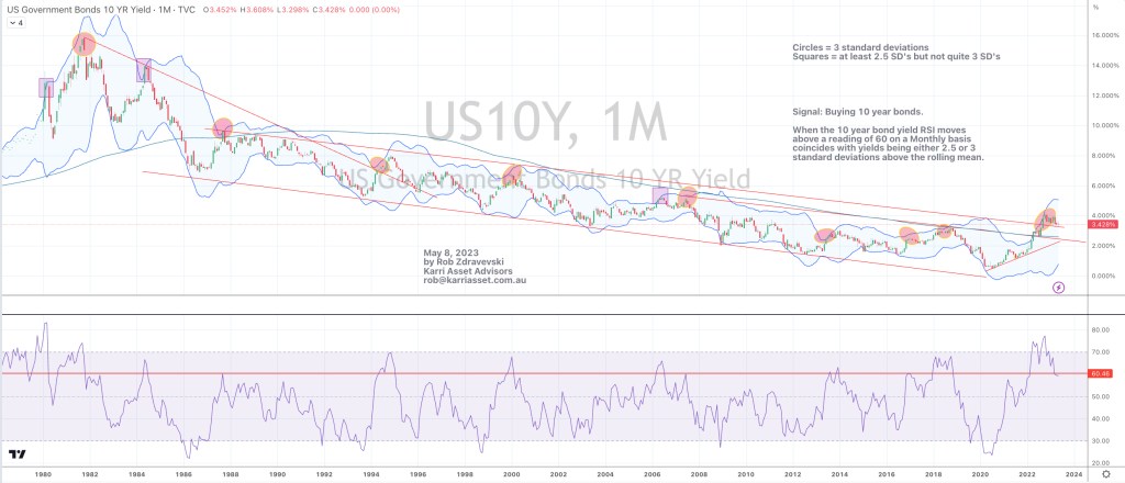 When the 10 year bond yield RSI moves above a reading of 60 on a Monthly basis coincides with yields being either 2.5 or 3 standard deviations above the rolling mean.