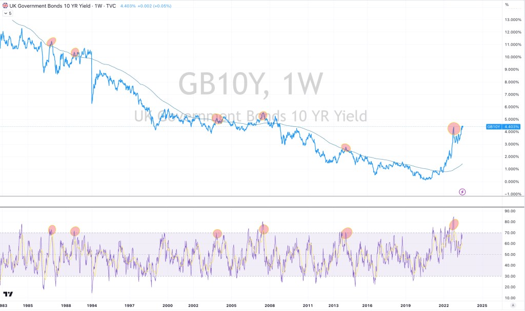 British 10 year government bond yields are seldom this distance above its 200 week moving average while simultaneously registering a weekly overbought reading.