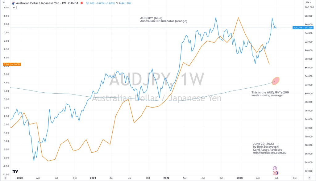 The chart below shows the symbiotic dance between the AUD/JPY currency cross and the Australian CPI reading.