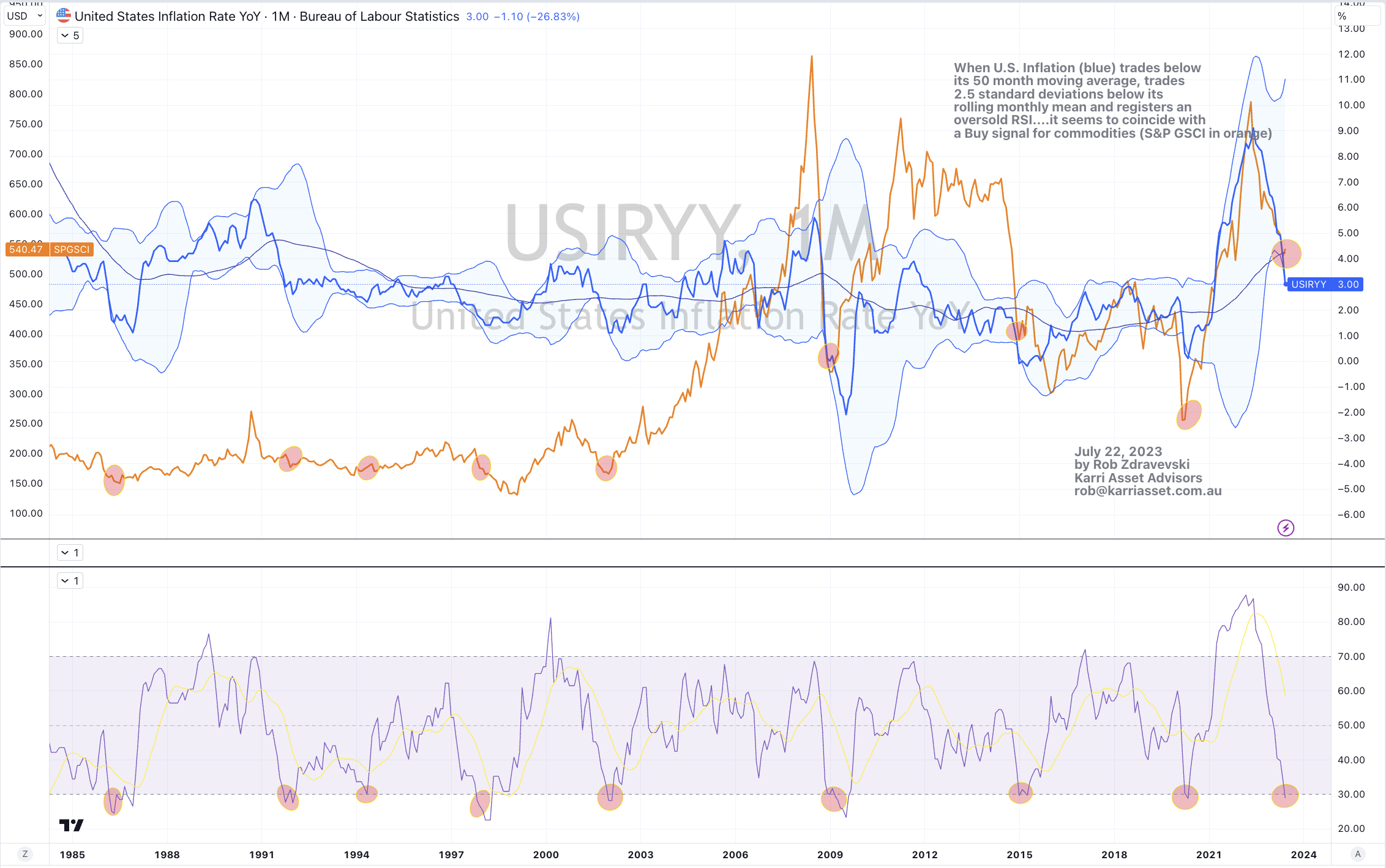 When the U.S. Inflation Rate (blue) ventures below its 50 month moving average, it trades 2.5 standard deviations below its rolling monthly mean and also registers an oversold RSI reading….it seems to coincide with a Buy signal for commodities, with the S&P Goldman Sachs Commodity Index represented in orange.