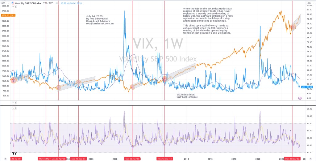 When the RSI on the VIX Index trades at a reading of 38 or below (note it has never registered a weekly oversold reading of below 30), the S&P 500 embarks on a rally against an economic backdrop of trying and testing conditions or headwinds.