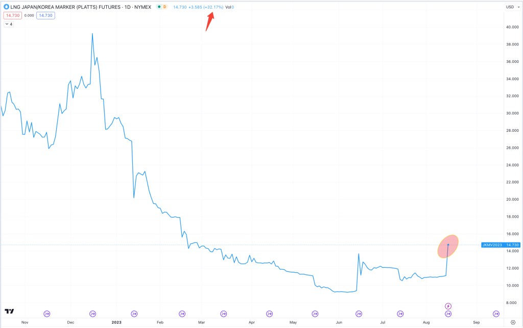 Today, the U.S. traded (CME) LNG Japan Korea Marker “JKM” (Platts) futures contract jumped 34%.
