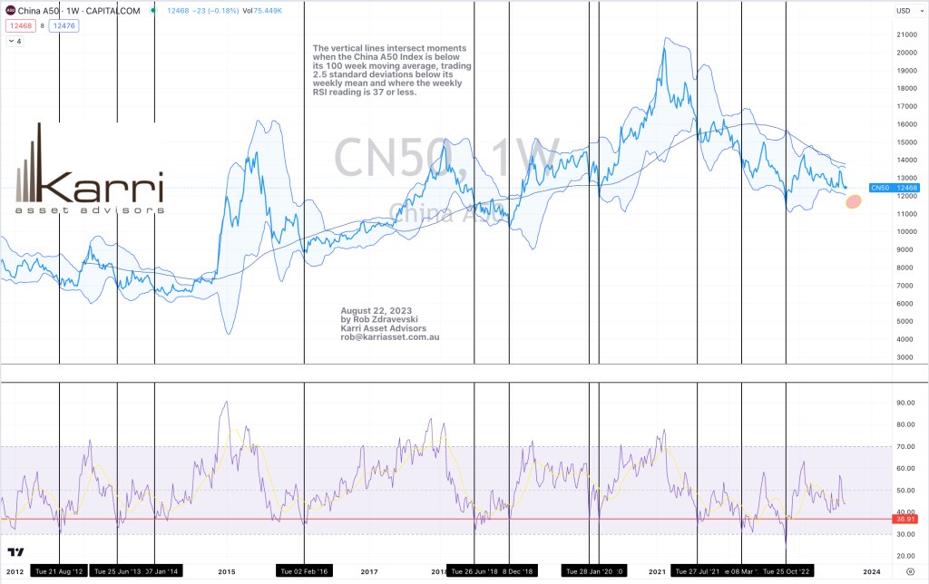 While ‘everyone is short’ China…..in the study below, the vertical lines intersect moments when the China A50 Index is below its 100 week moving average, trading 2.5 standard deviations below its weekly mean and where the weekly RSI reading is 37 or less.