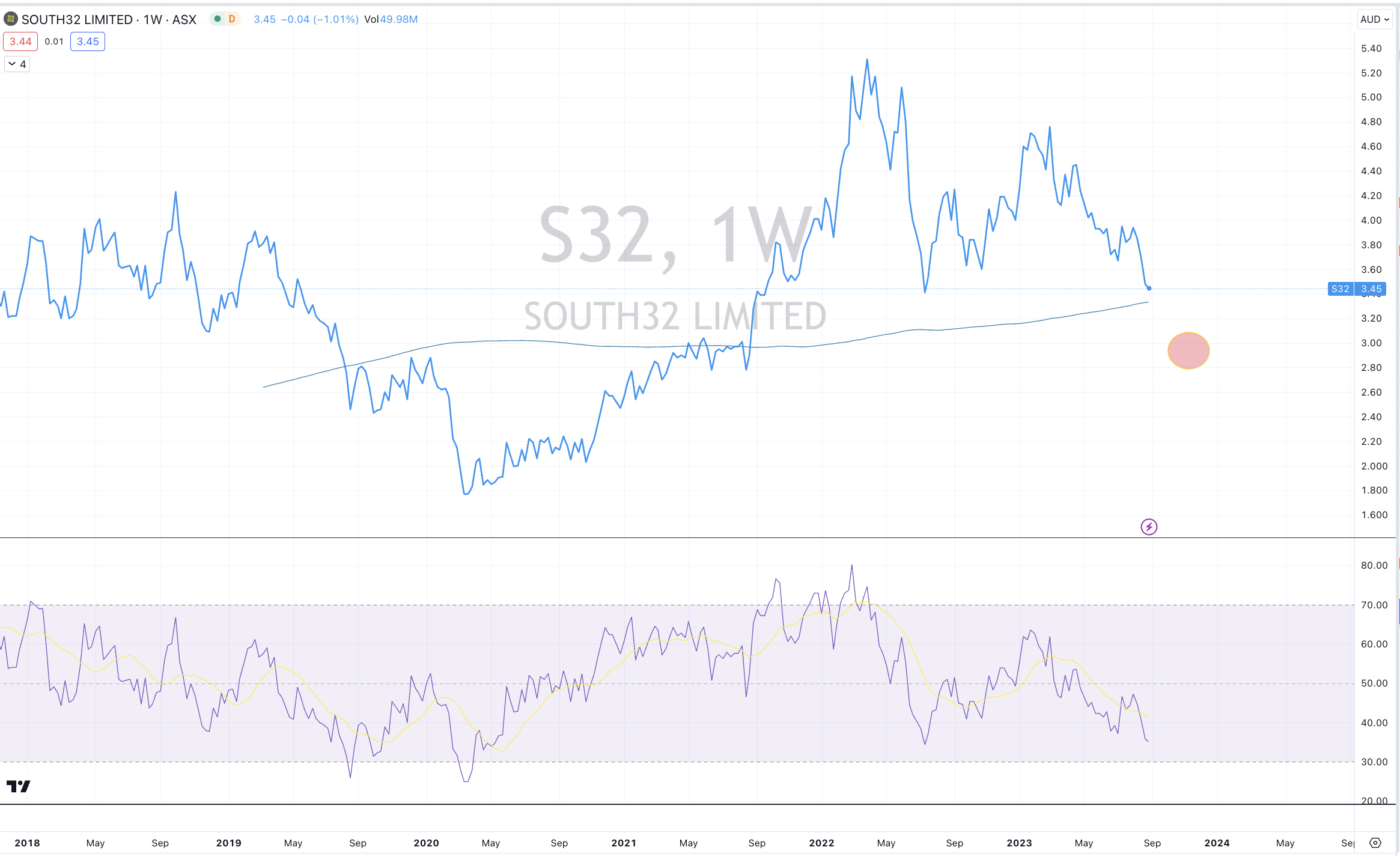 This chart and study of Australian domiciled metals and mining company, South32 is an example of a stock price mean reverting back to its 200 week moving average.