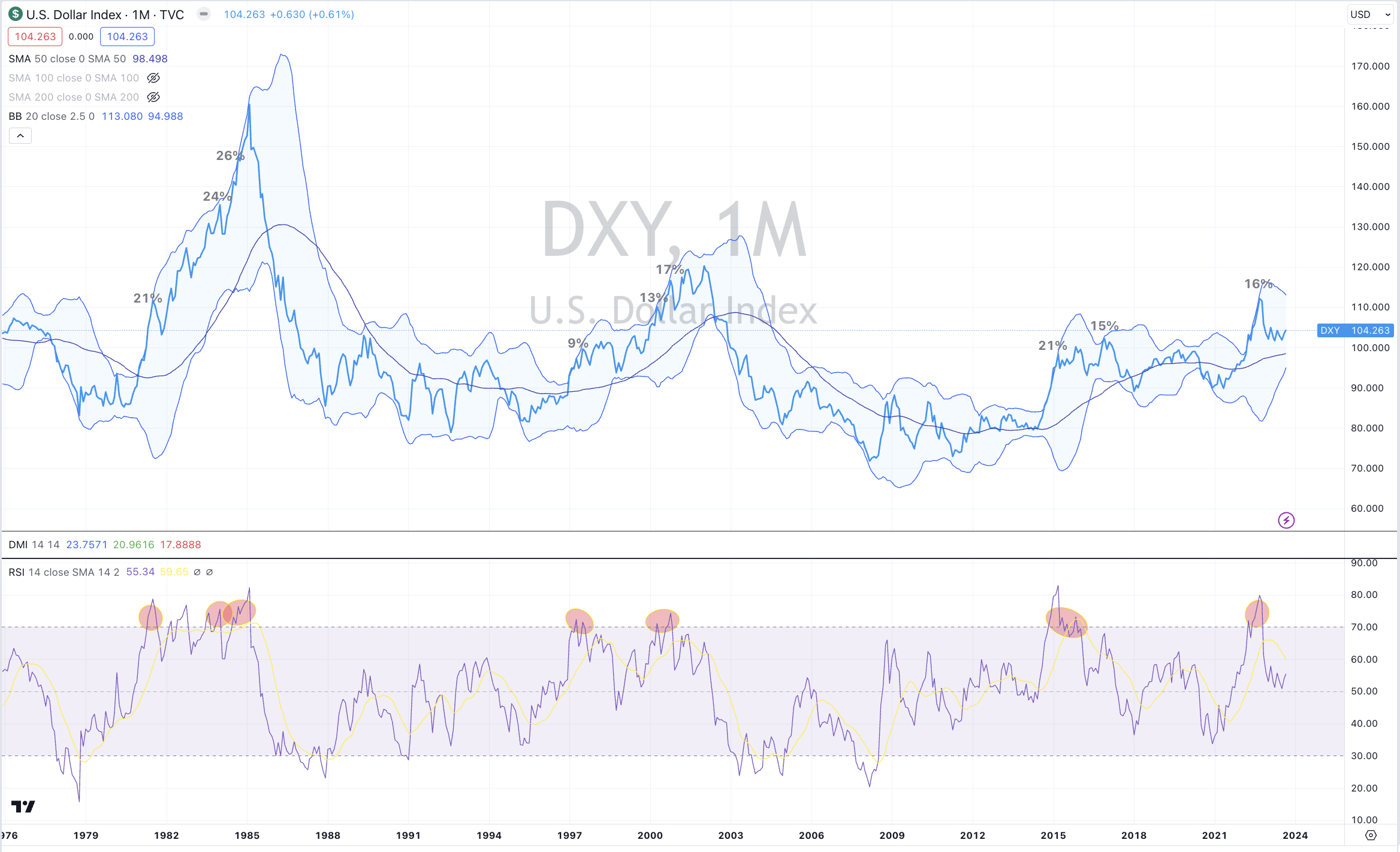 The study below shows the percentages that the DXY Index was trading above its 50 month moving average whilst also registering a monthly overbought reading along and when the price was also 2.5 standard deviations above its rolling monthly mean.