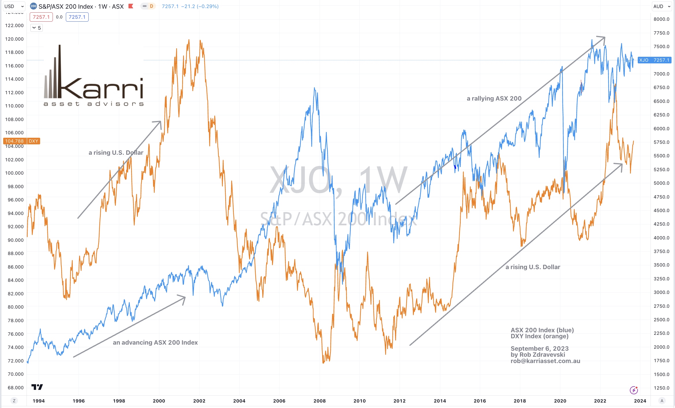 The study below shows that the ASX 200 can rally while the U.S. Dollar is also rising.