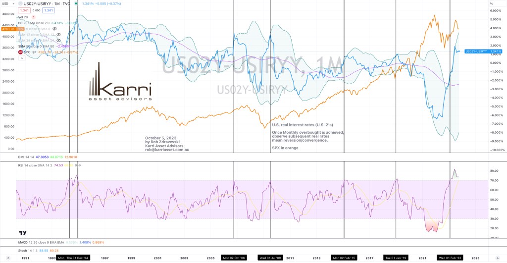 Once Monthly overbought is achieved, observe subsequent real rates mean reversion/convergence.