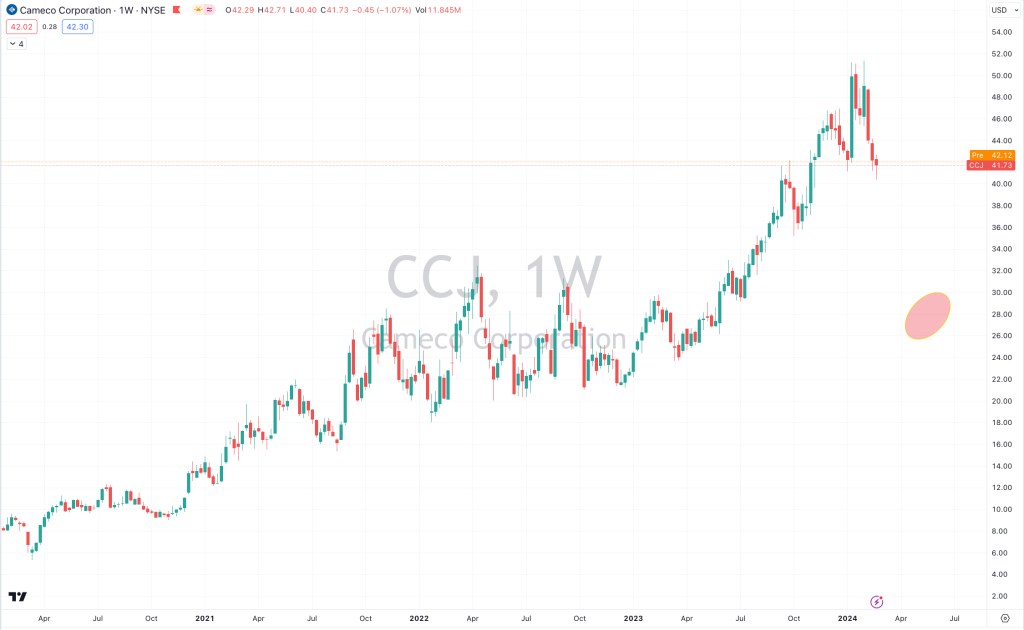 If I could express what I think is next, through the NYSE listed share price of #Cameco, I’ll await for CCJ.N to come back to the $27-$30 mark somewhere in the May-July 2024 timeframe before adding some more.