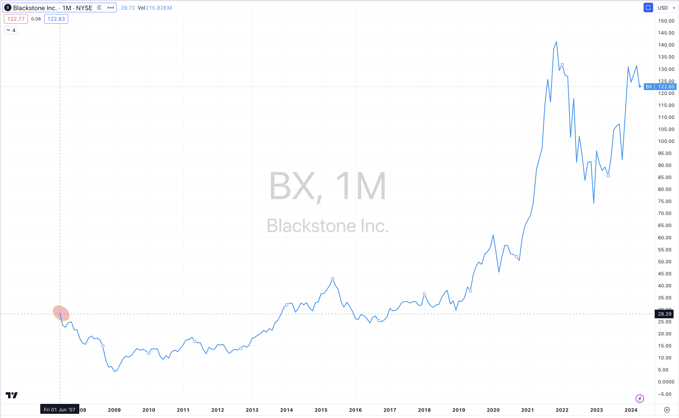 Next, Blackstone went public in June 2007 when its IPO was priced at $31.