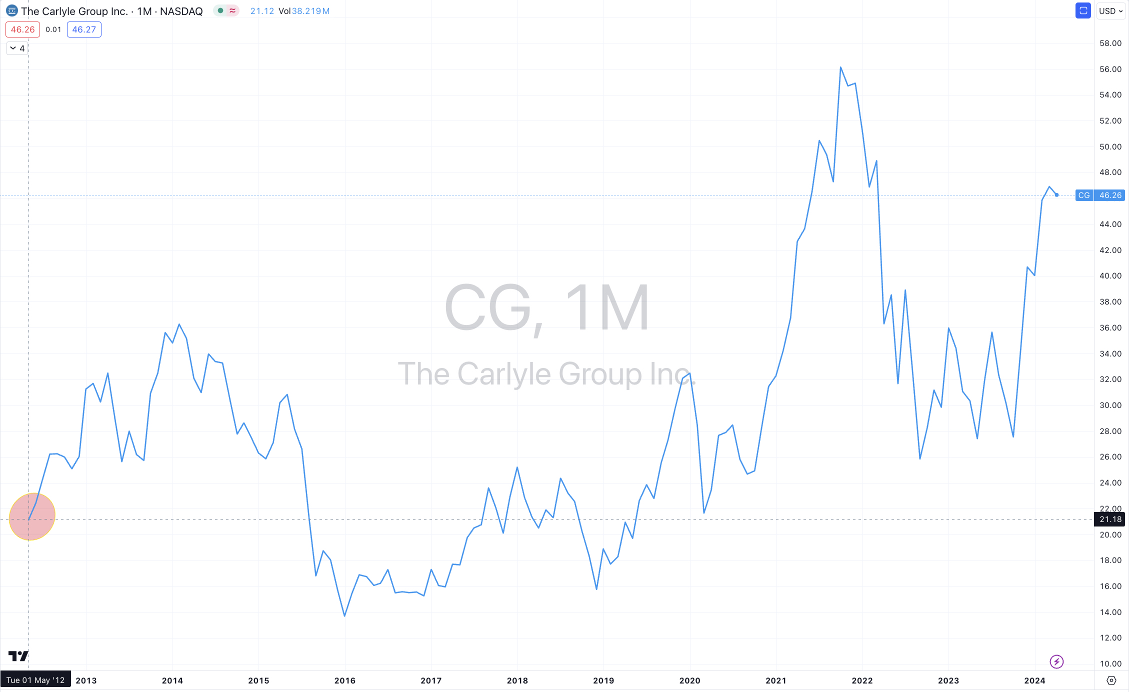 The Carlyle Group went public on May 3, 2012, and the IPO was priced at $22 per unit.