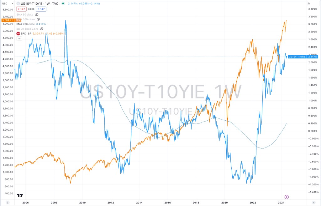 When the blue line (the U.S. 10 year yield minus the 10 year breakeven inflation rate) trades above and to some considerable percentage above its 200 week moving average, it results in the S&P 500 either peaking or stifling any further advance.